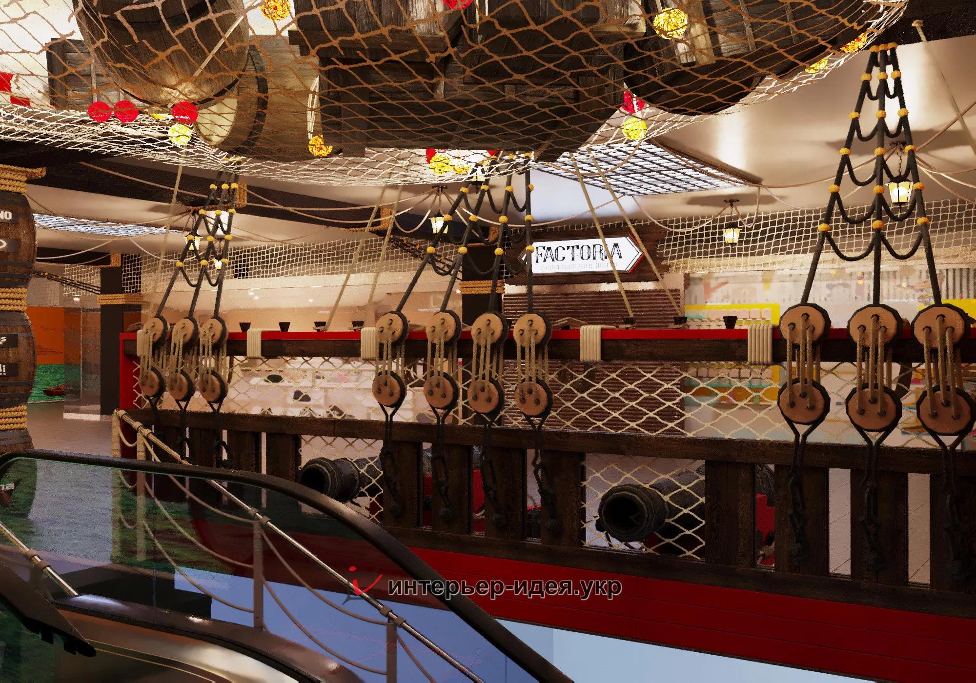 Елементи декору – бочки, сітки, канати, гамаки та інша морська атрибутика.