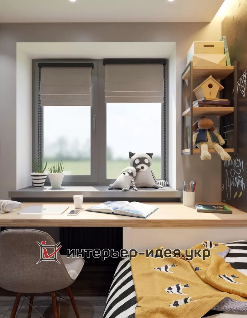 Так як кімната дитяча, а лофт передбачає грубі матеріали і поверхні, ми вирішили зробити її більш спокійною, без цегли та бетонних стін.