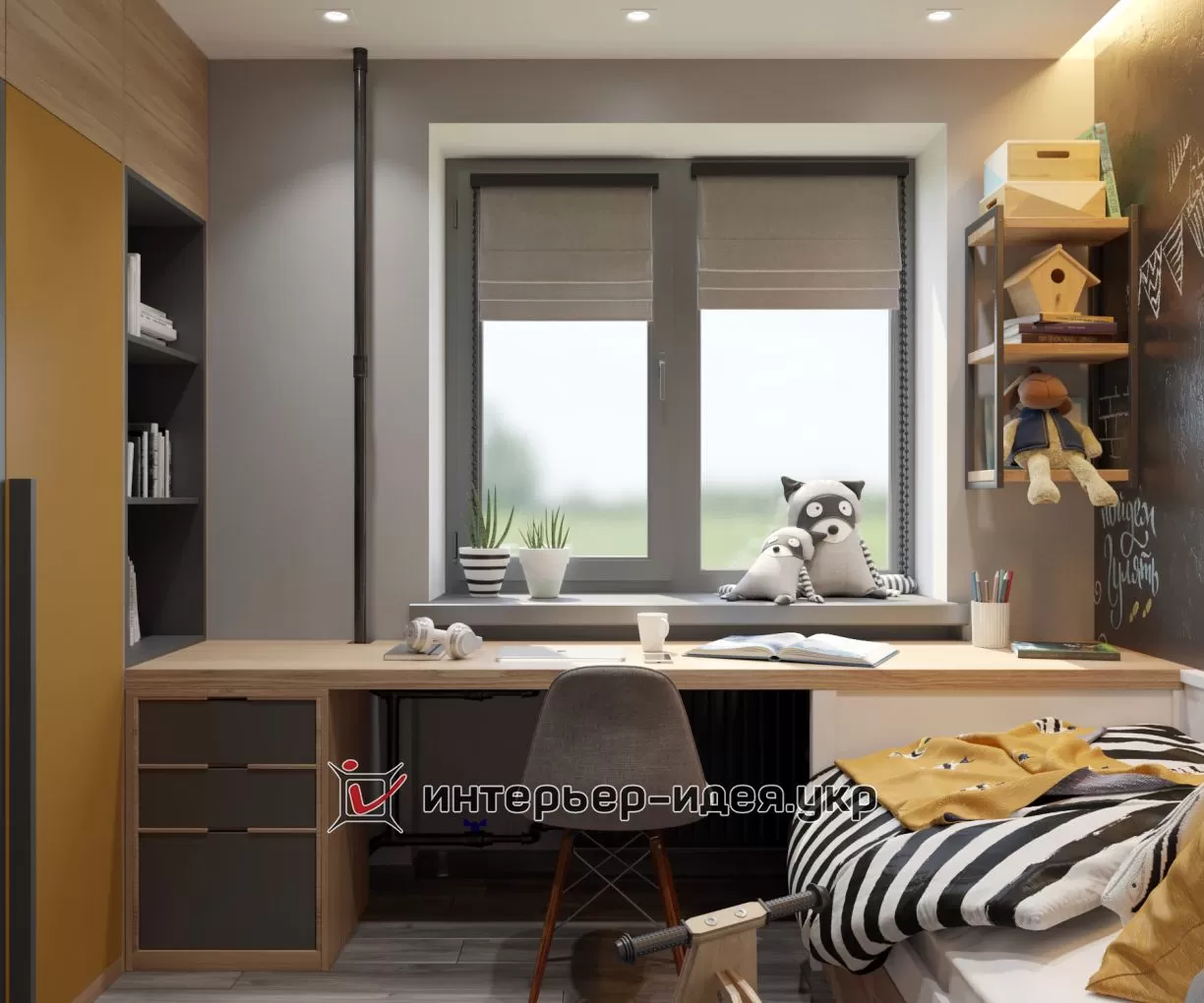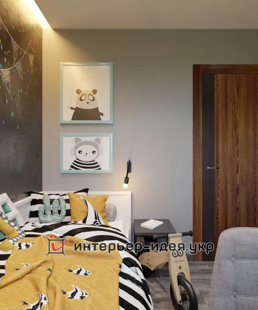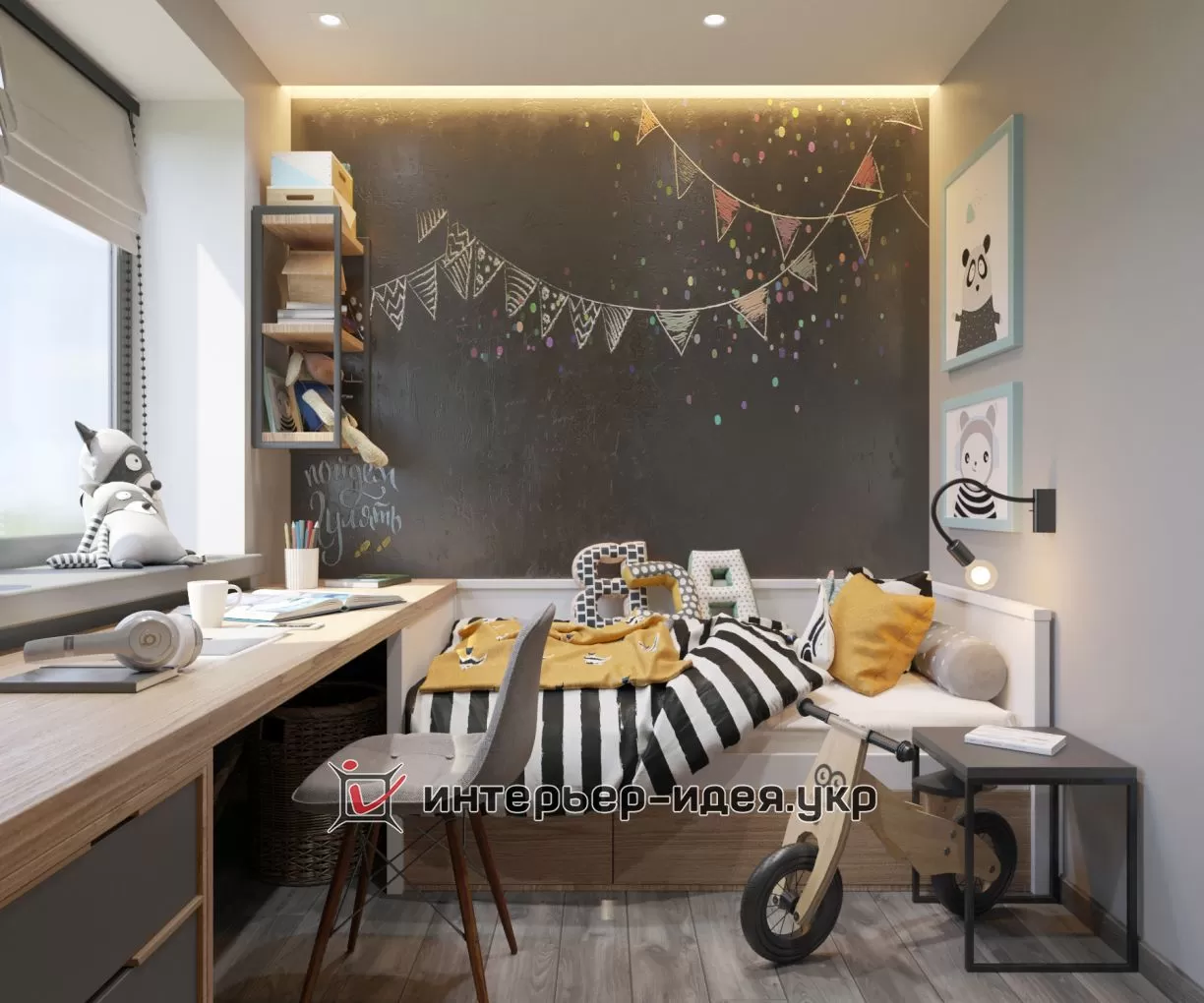 Всі ми знаємо, як діти люблять малювати по стінах, тому ми вирішили оформити основну акцентну стіну штукатуркою, по якій можна безмежно малювати, змивати і знову малювати.