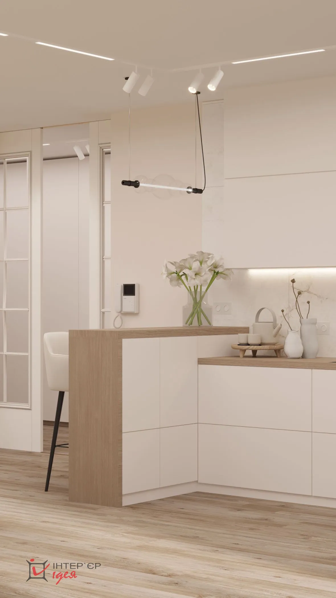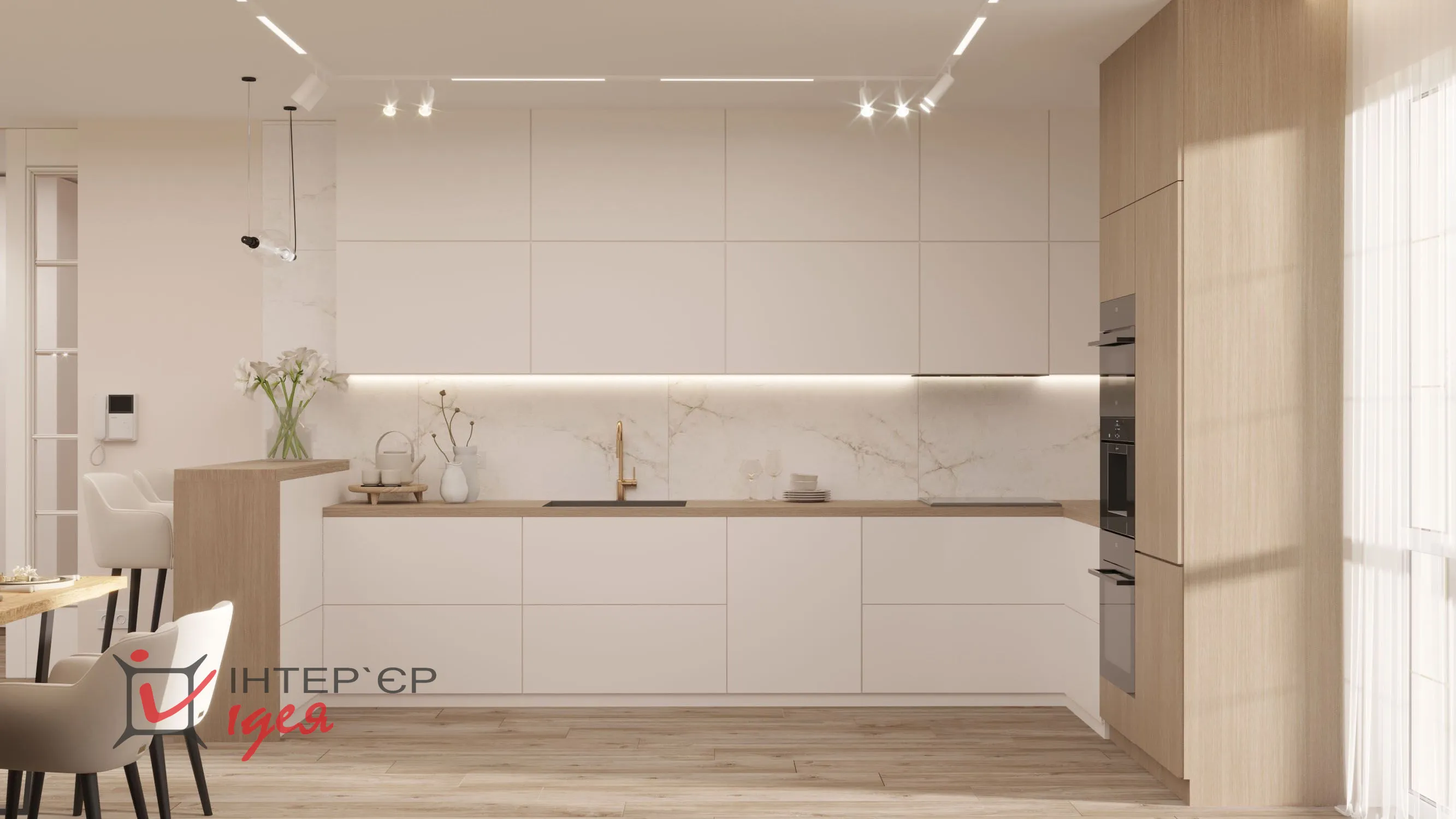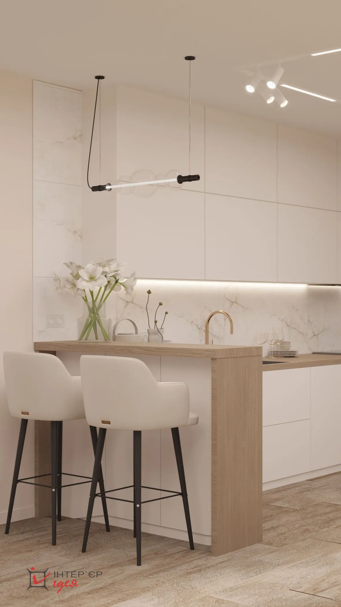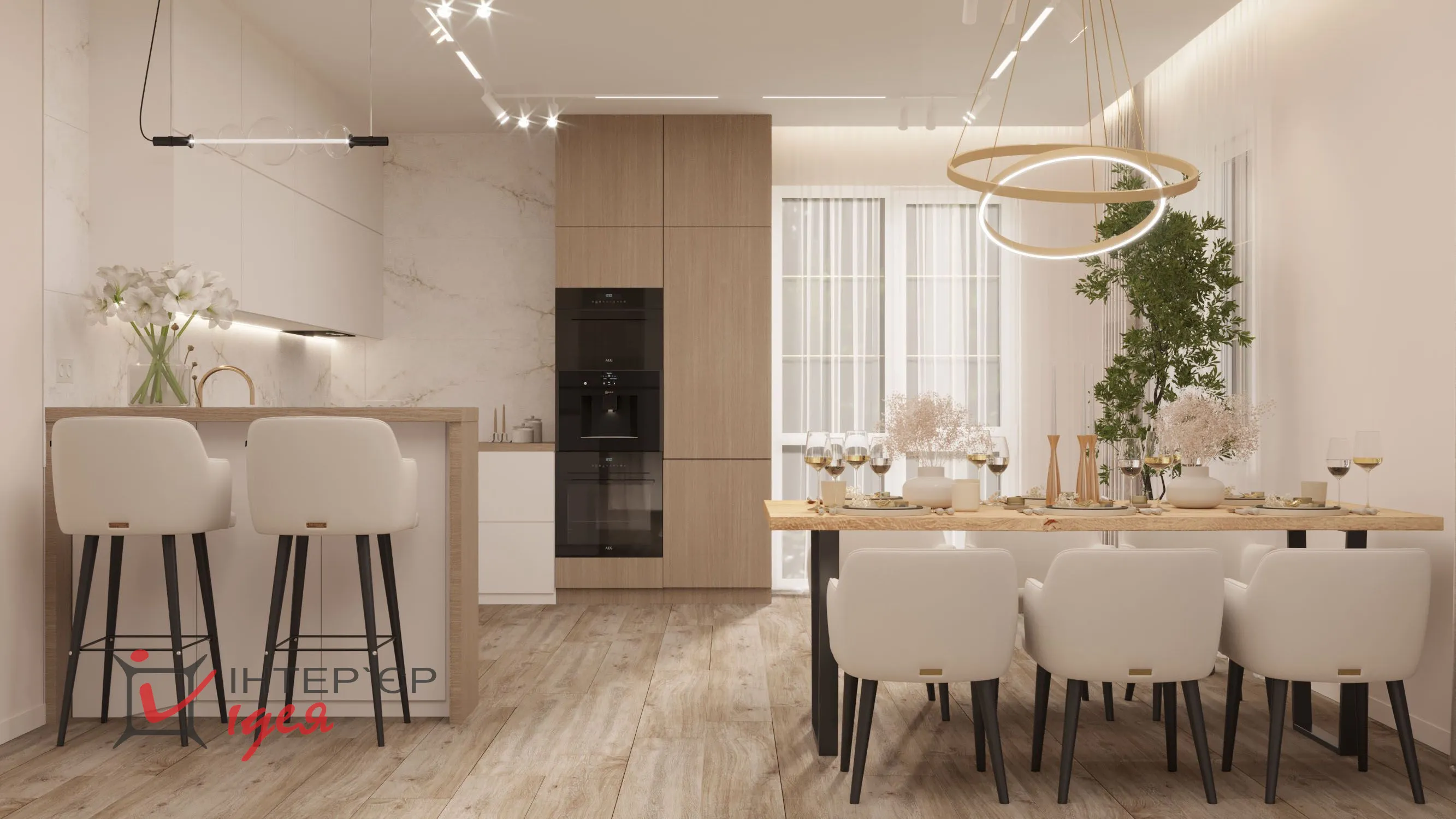 Світлі кремові та дерев'яні відтінки гармонійно поєднуються з текстурою мармуру на стіні кухонної зони. Барні стільці та стільці для обіднього столу мають м'яку оббивку, що додає комфорту. Елегантні люстри геометричної форми з м'яким підсвічуванням надають інтер'єру витонченості. Природні матеріали, дерев'яна підлога та декор у вигляді живих рослин створюють відчуття тепла та природності.