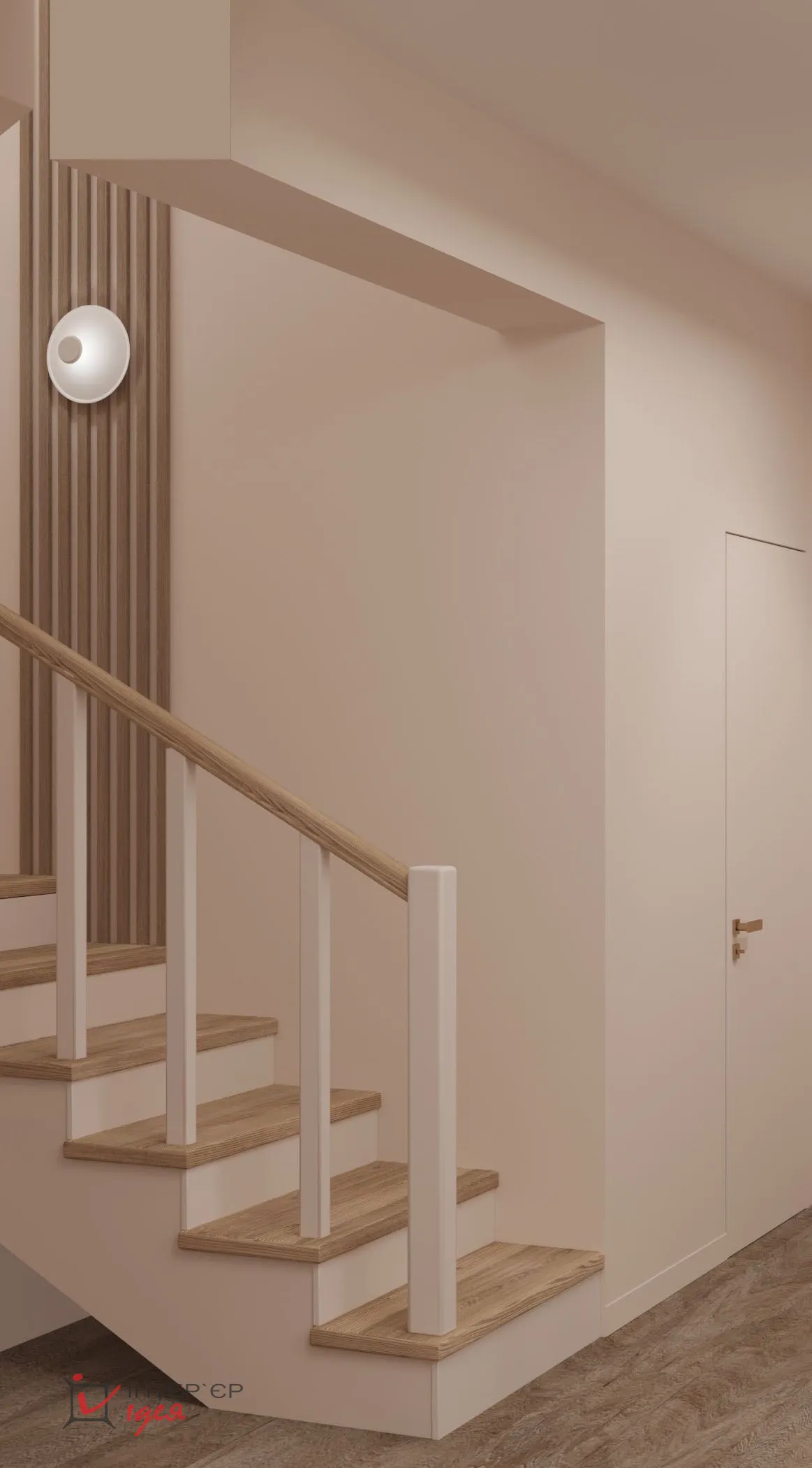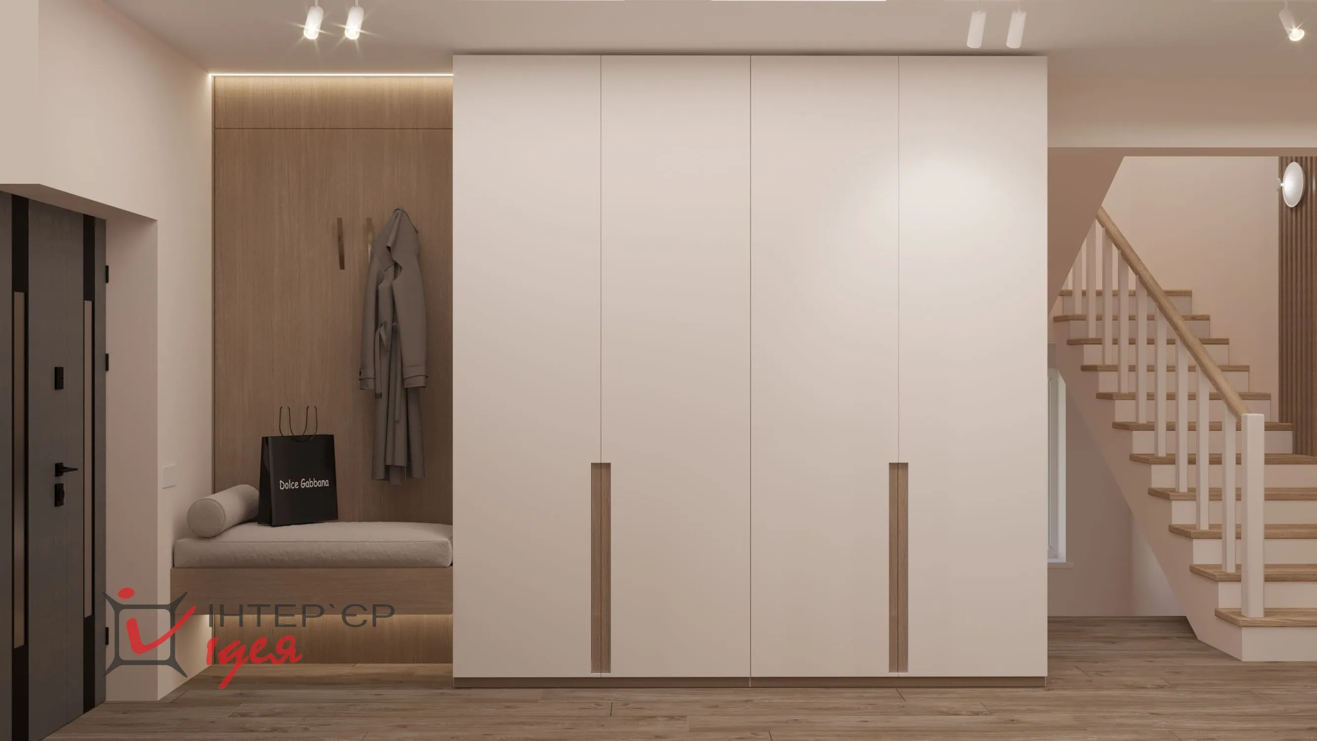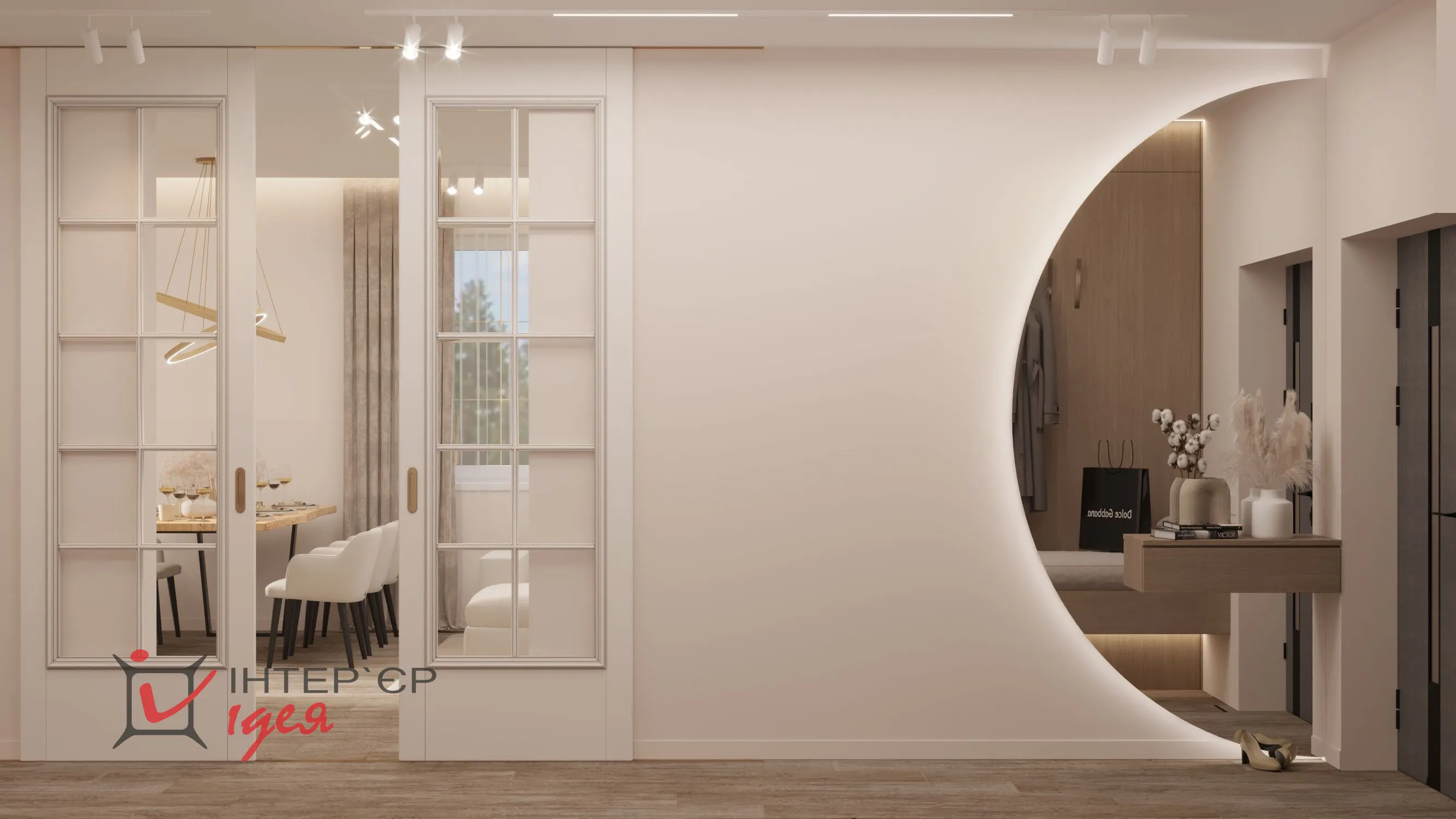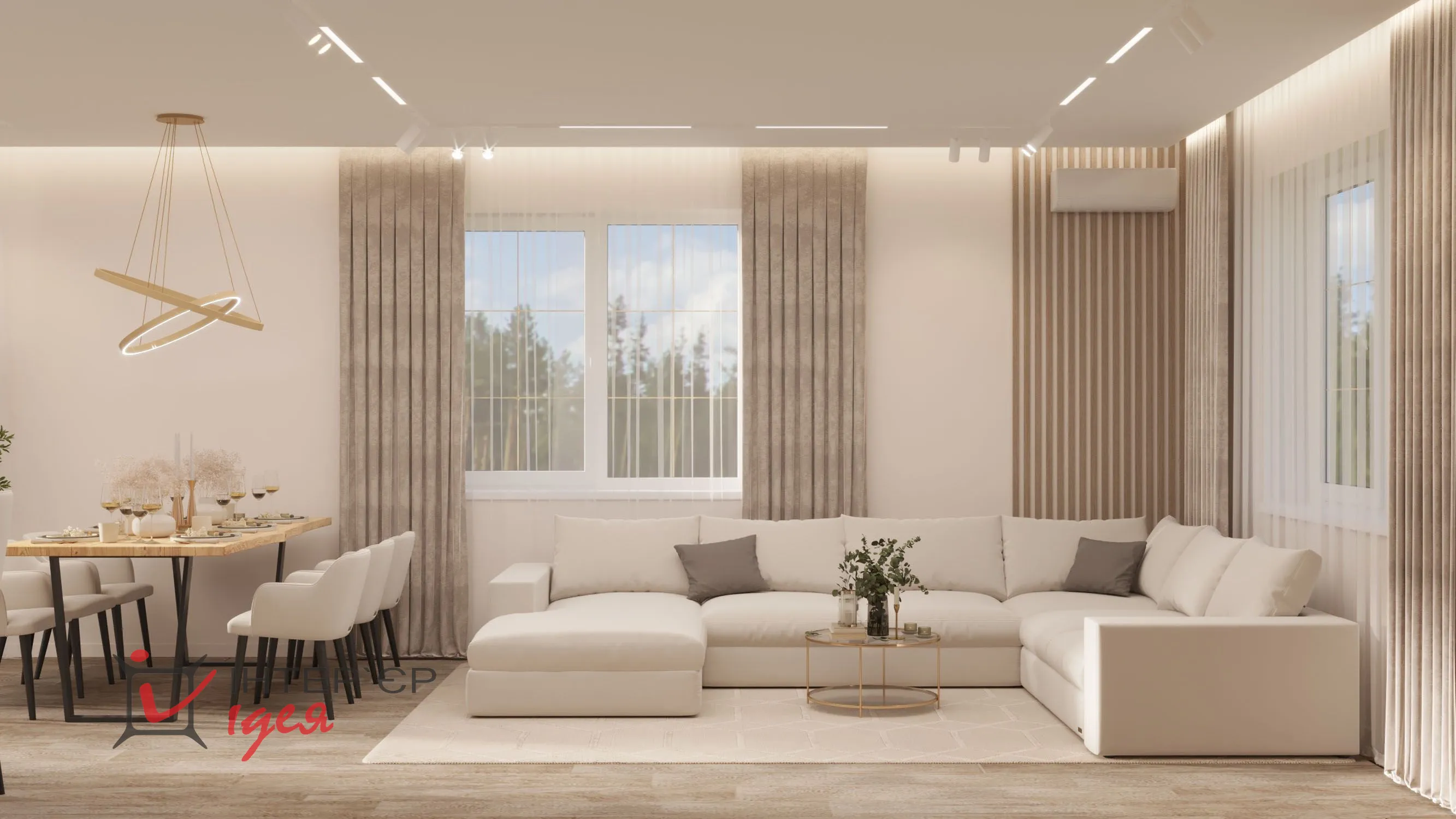 Світлі кремові та дерев'яні відтінки гармонійно поєднуються з текстурою мармуру на стіні кухонної зони. Барні стільці та стільці для обіднього столу мають м'яку оббивку, що додає комфорту. Елегантні люстри геометричної форми з м'яким підсвічуванням надають інтер'єру витонченості. Природні матеріали, дерев'яна підлога та декор у вигляді живих рослин створюють відчуття тепла та природності.