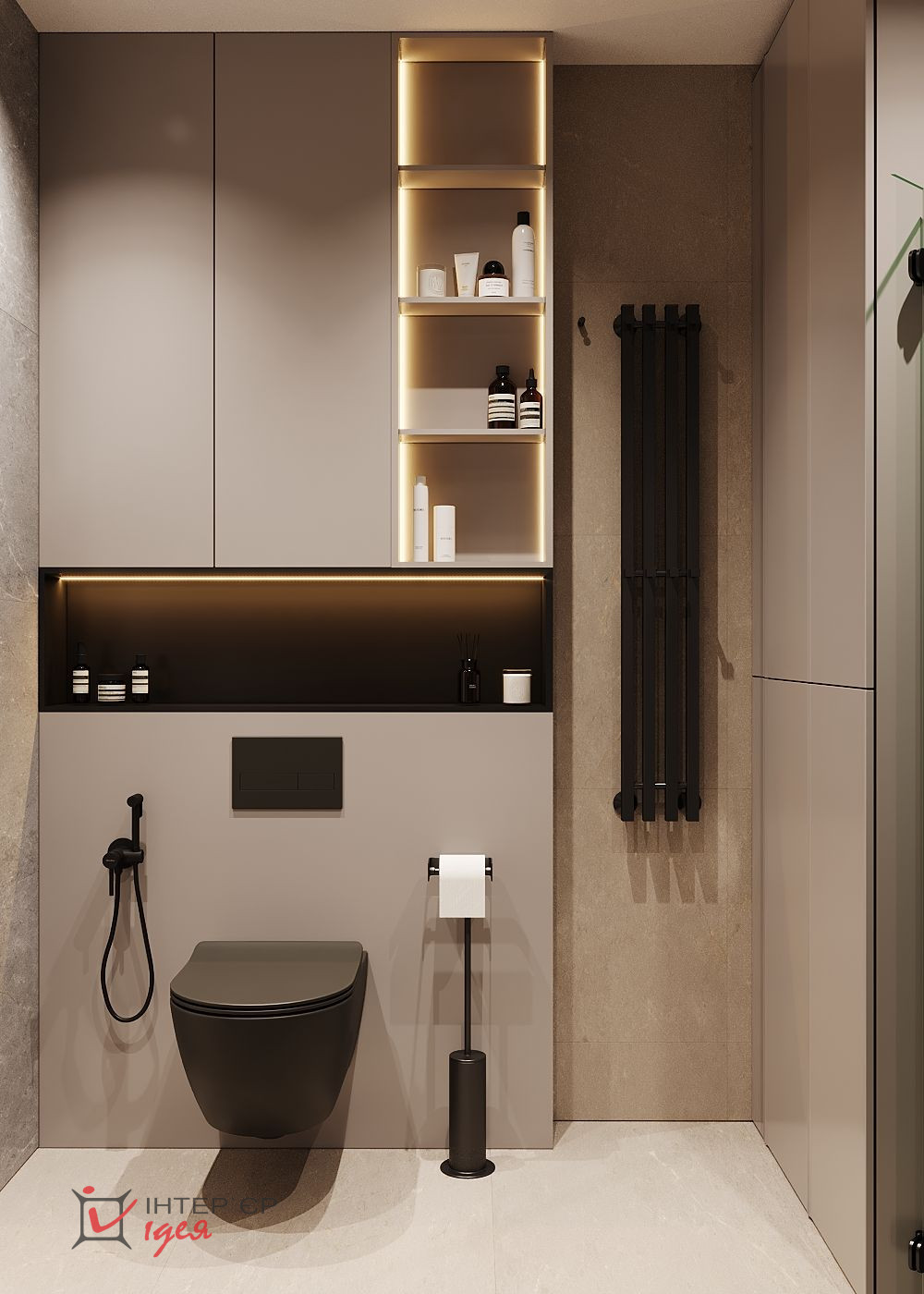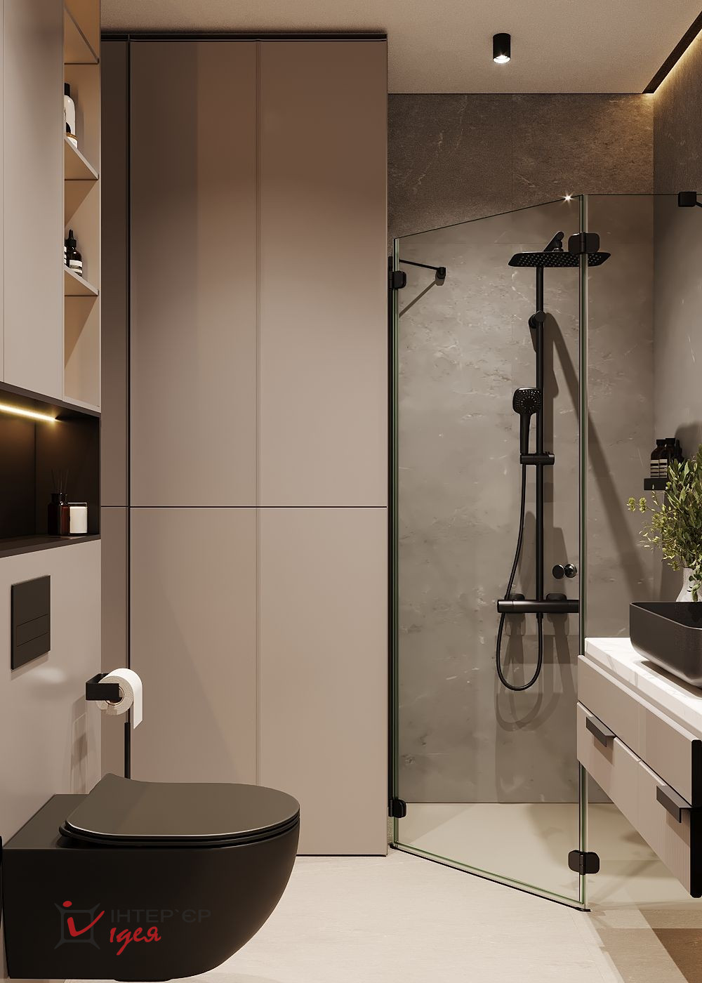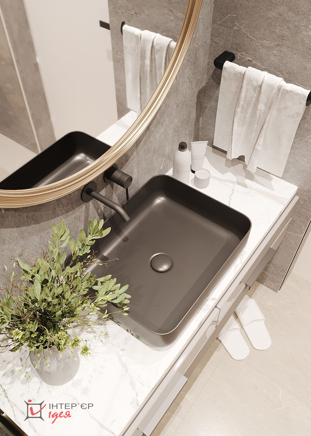Обрано було сіро-бежеву колірну гаму з додаванням графітових акцентів, - сантехніка та плитка. Навіть на невеликій площі нам вдалося розмістити все необхідне та створити стильний дизайн санвузла.