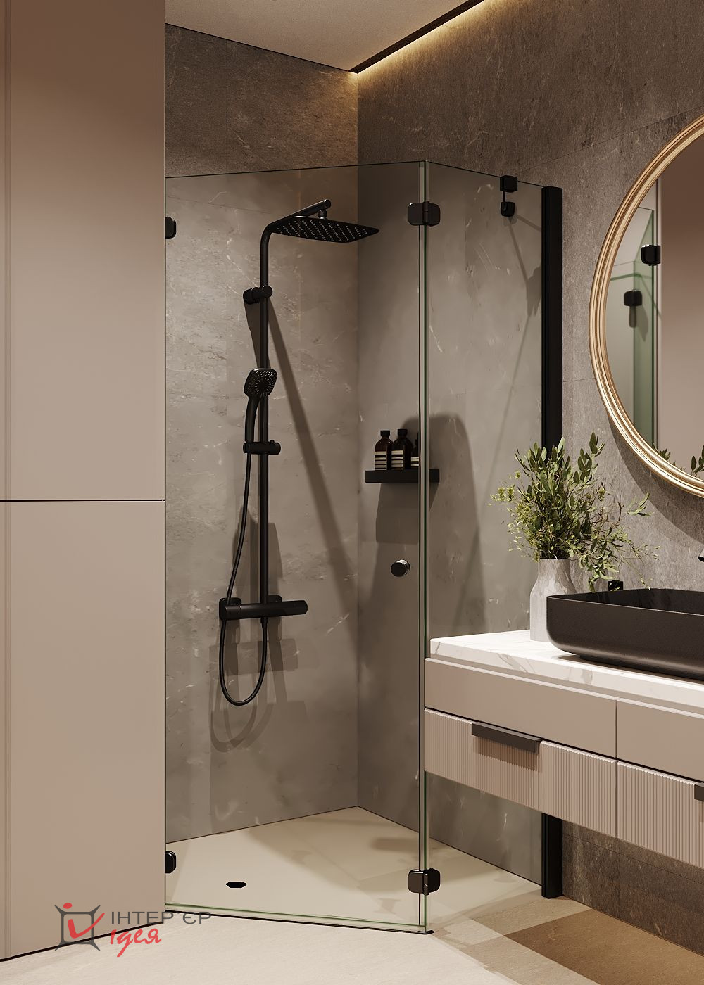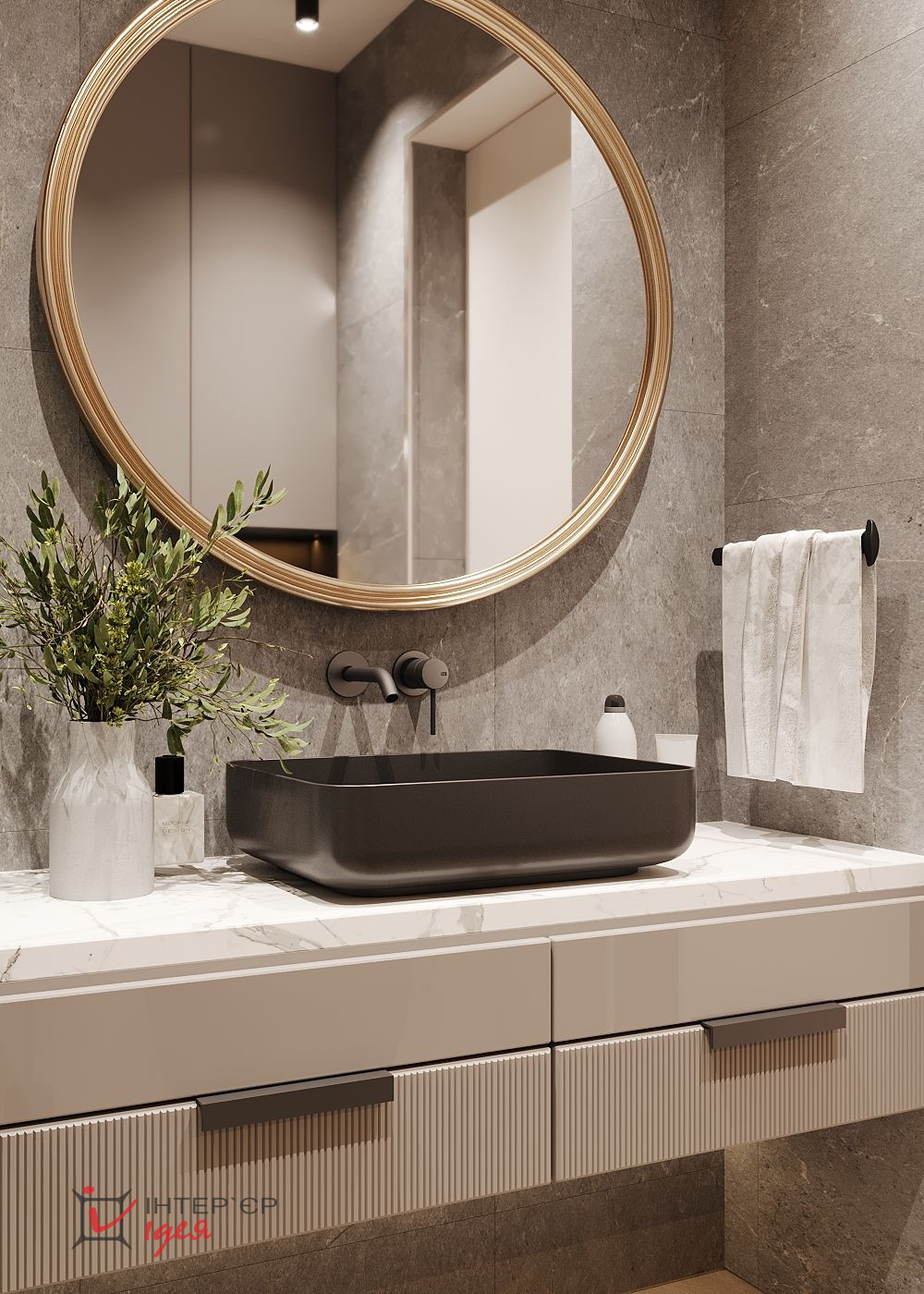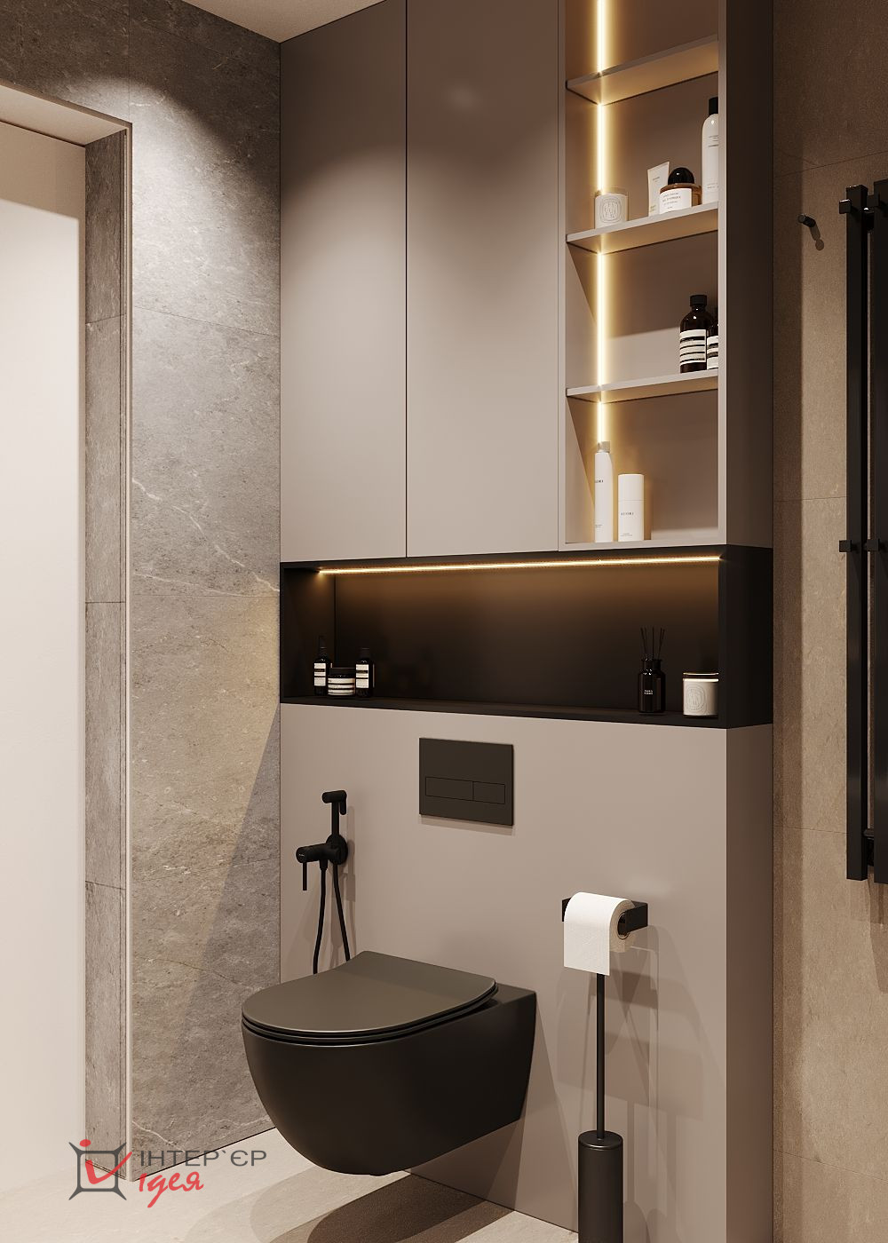 Обрано було сіро-бежеву колірну гаму з додаванням графітових акцентів, - сантехніка та плитка. Навіть на невеликій площі нам вдалося розмістити все необхідне та створити стильний дизайн санвузла.