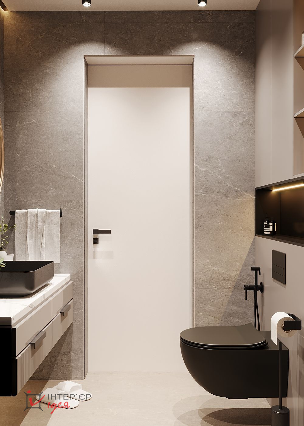 При розробці санвузла, основним побажанням замовника було розробити сучасний і функціональний санвузол, з світло-темною гаммою, можливо з додаванням темних акцентів.