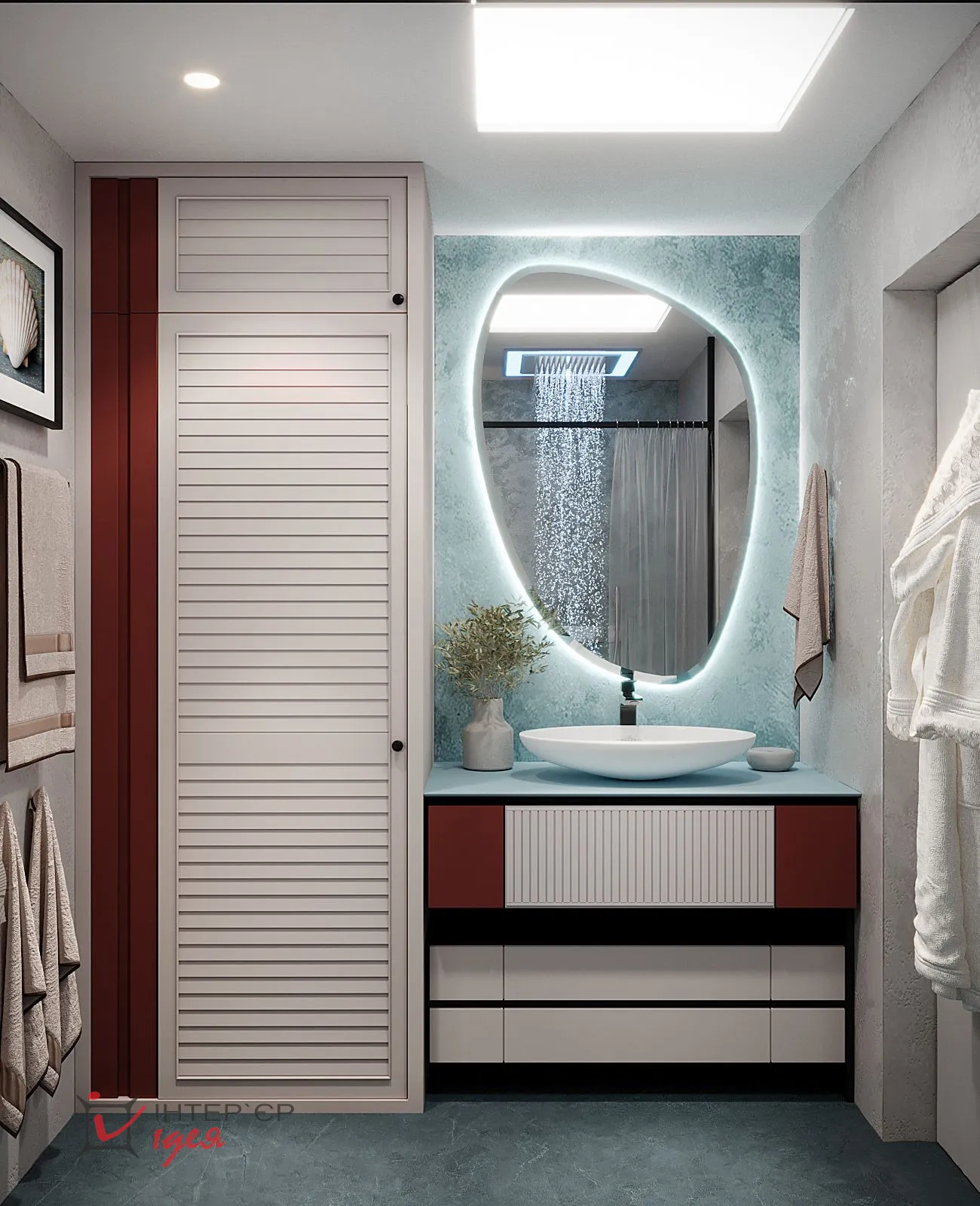 Стіни та підлога в санвузлі виконані мікроцементом пастельних тонів. Ніша для зберігання в душовій кабіні, верхній ящик під умивальником, ніша над інсталяцією та вертикальний фасад висувної сушарки за пеналом із пральною та сушильною машинами пофарбовані у насичений винний колір, який створює контрастні акценти.