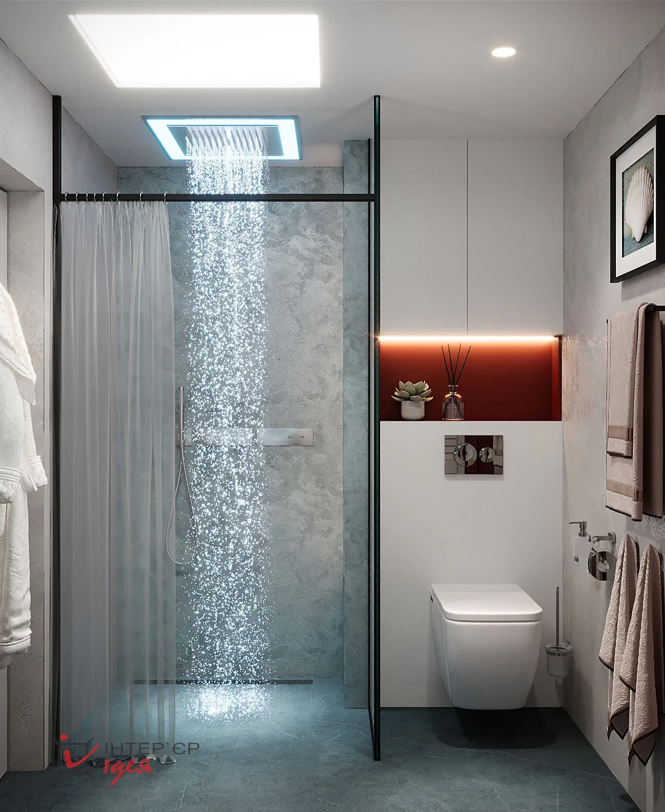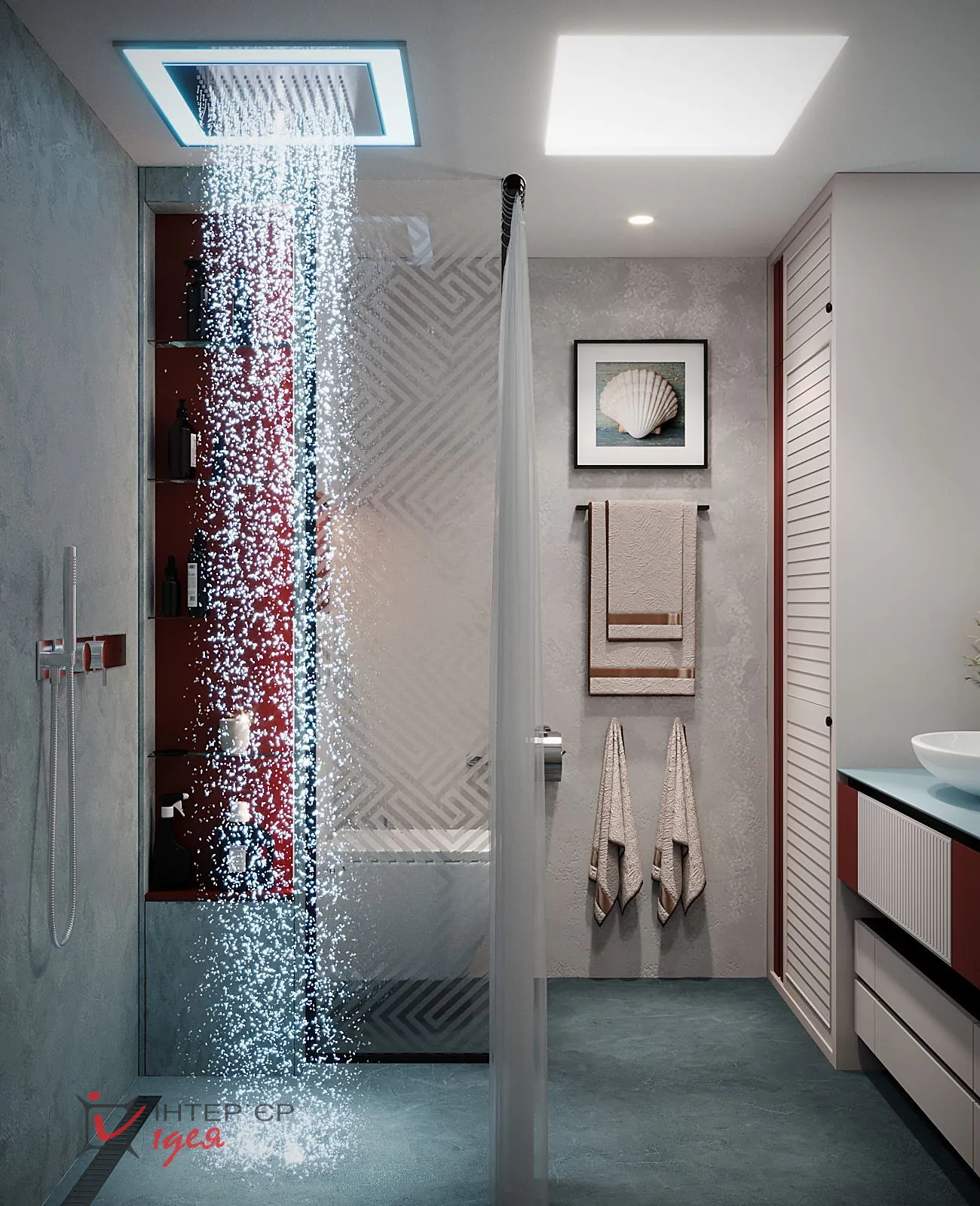 Навколо дзеркала передбачено контражурне підсвічування. Душова кабіна висвітлюється зі світлодіодного профілю у вигляді квадрата навколо тропічного душу та світлодіодним підсвічуванням ніші для зберігання миючих засобів. Замість сушарки для рушників передбачена тепла стіна навпроти вхідних дверей.
