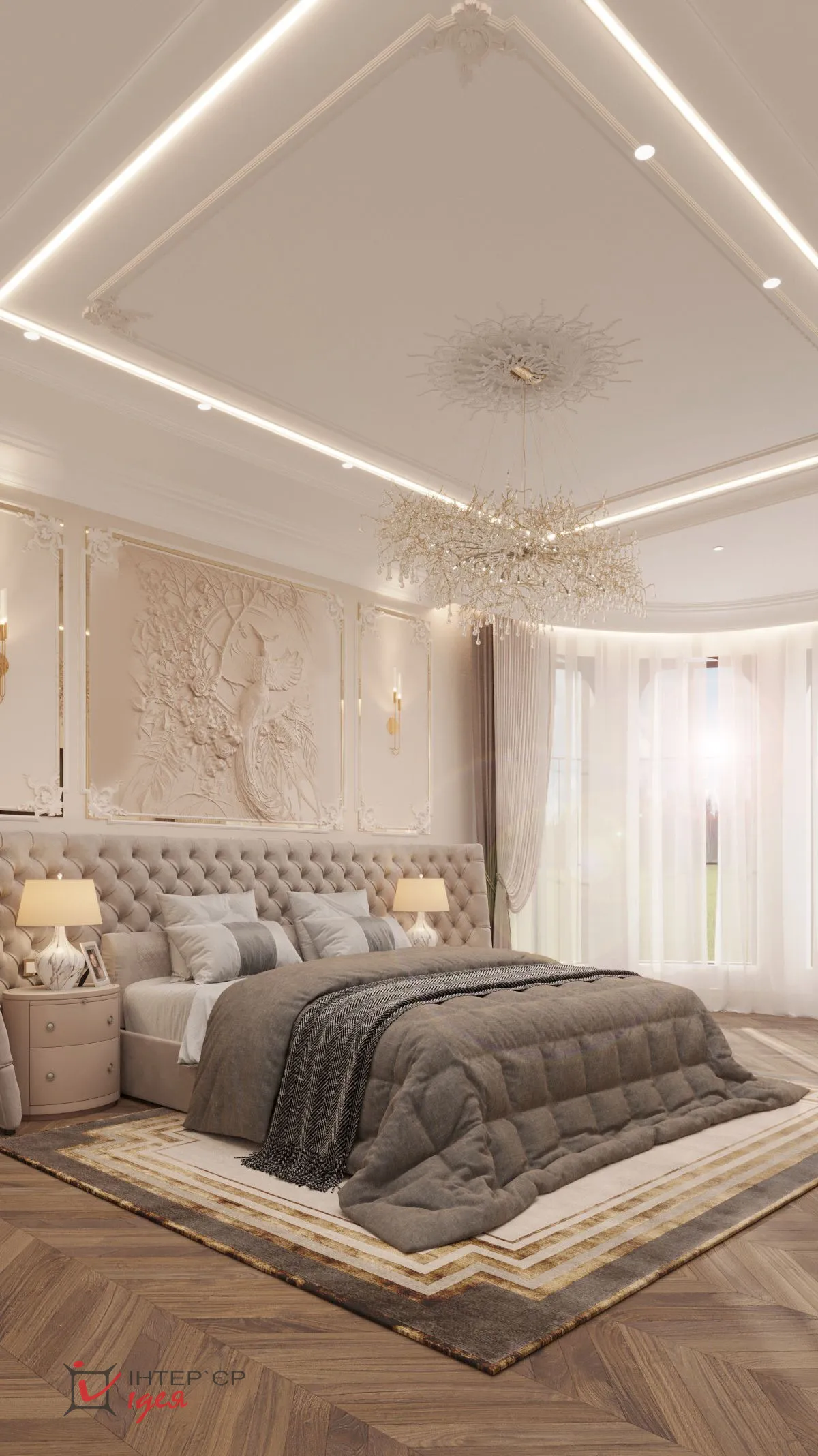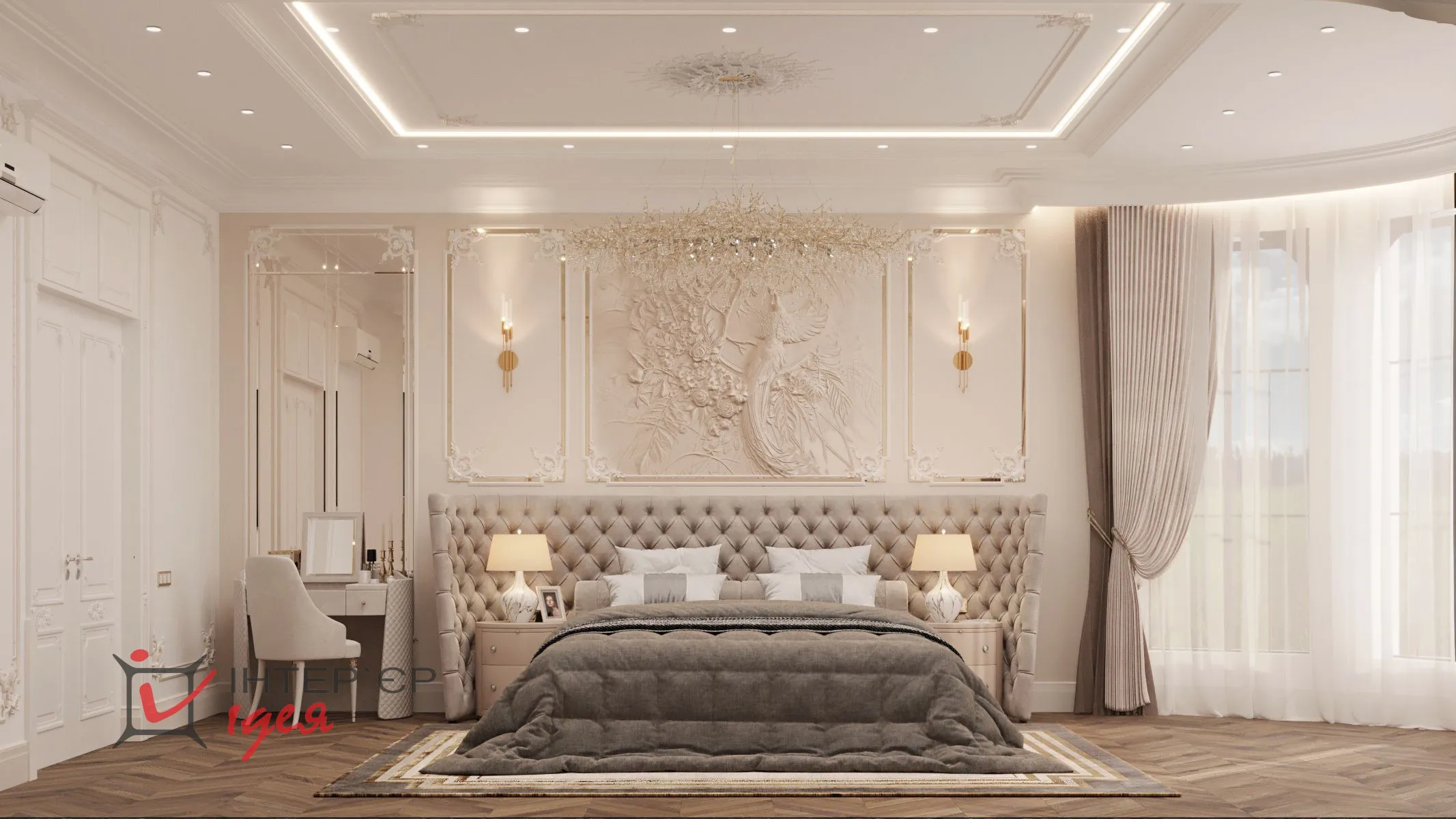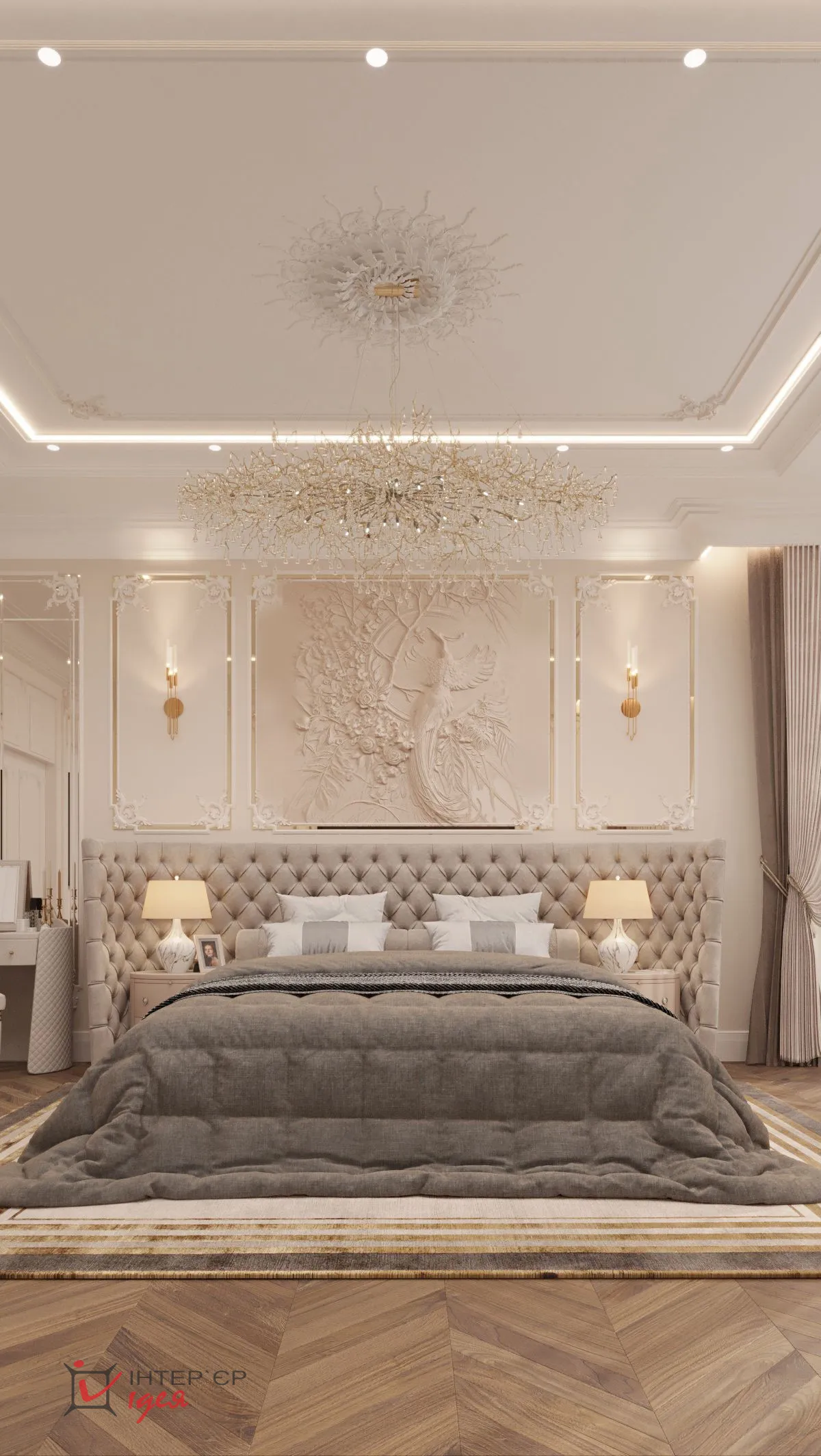 Стіни спальні оздоблені світлими, пастельними тонами, що візуально розширює простір і створює відчуття легкості та повітряності. Над ліжком розміщено велике декоративне панно з оригінальною ліпниною, яке додає інтер'єру вишуканості та індивідуальності.