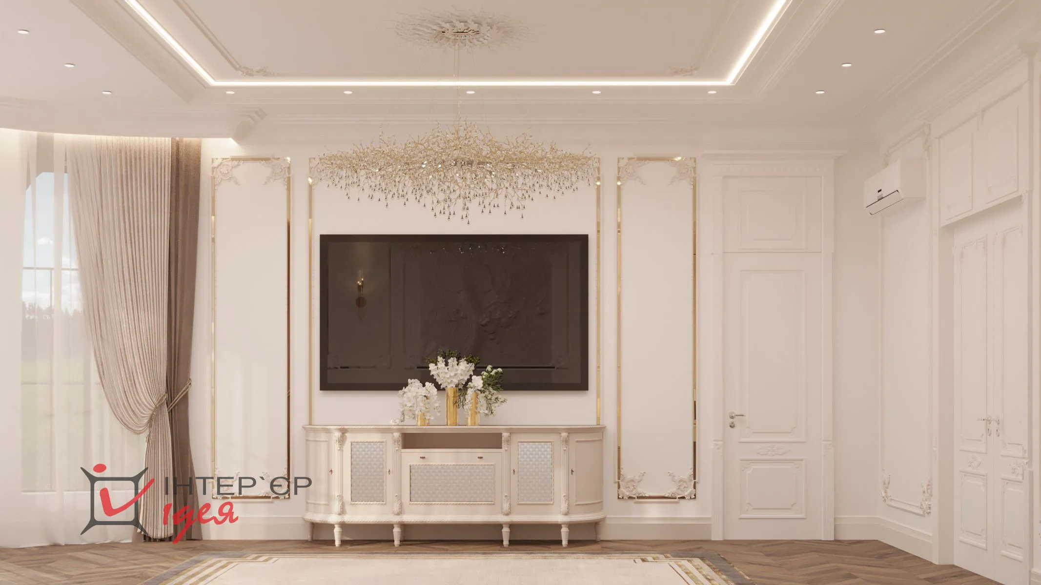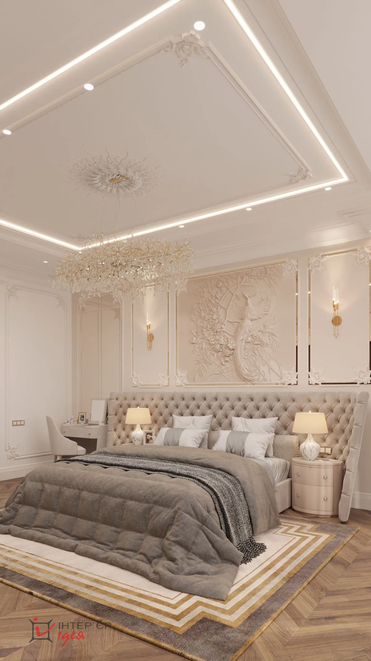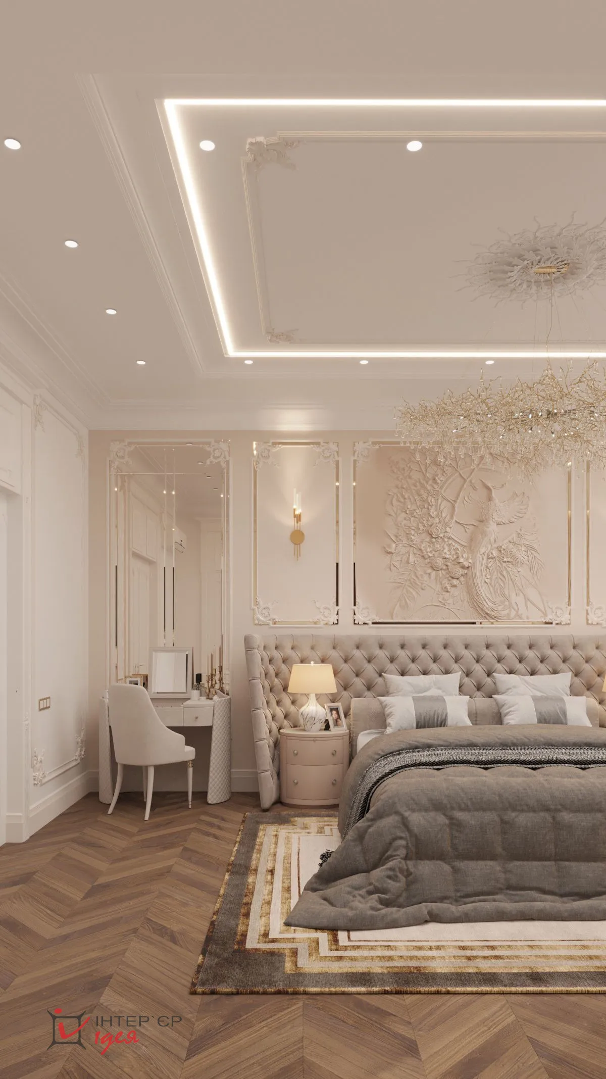 Стіни спальні оздоблені світлими, пастельними тонами, що візуально розширює простір і створює відчуття легкості та повітряності. Над ліжком розміщено велике декоративне панно з оригінальною ліпниною, яке додає інтер'єру вишуканості та індивідуальності.