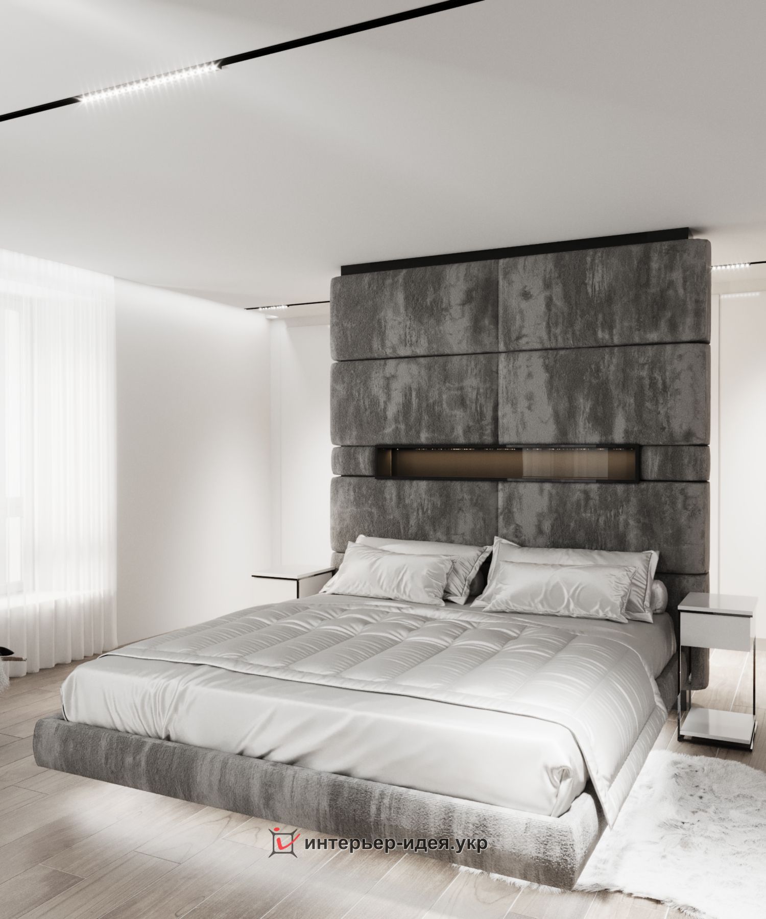 Кімната має вихід на балкон і велике вікно майже до підлоги. Така архітектура кімнати дозволила розмістити ліжко практично посеред кімнати, сформувавши таким чином зону зберігання одягу та туалетного столика біля входу та зону релакса, ліжко та шезлонг.