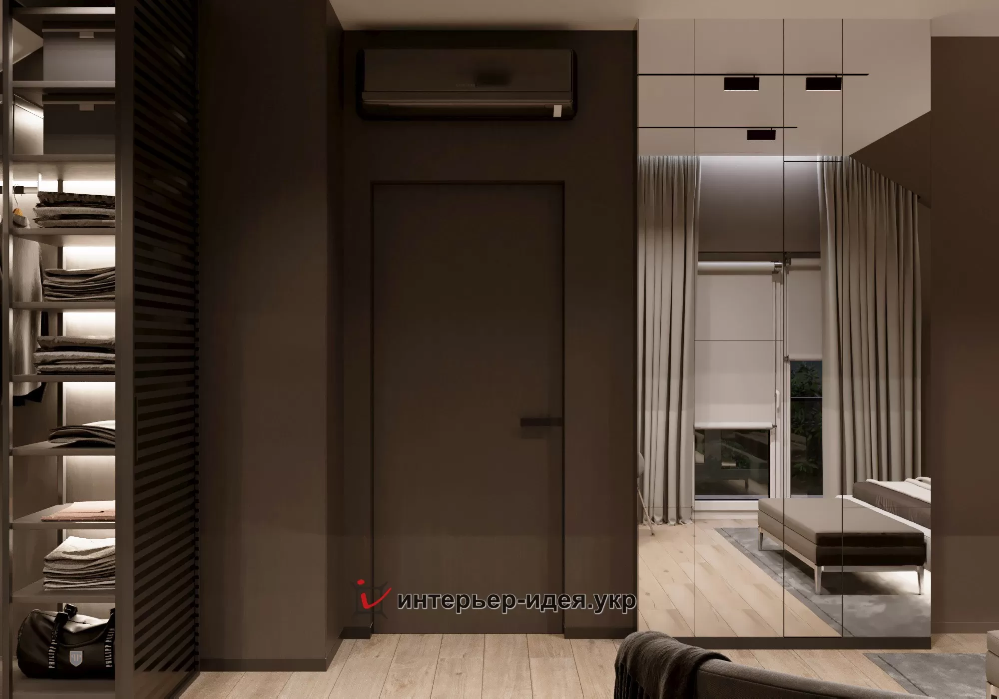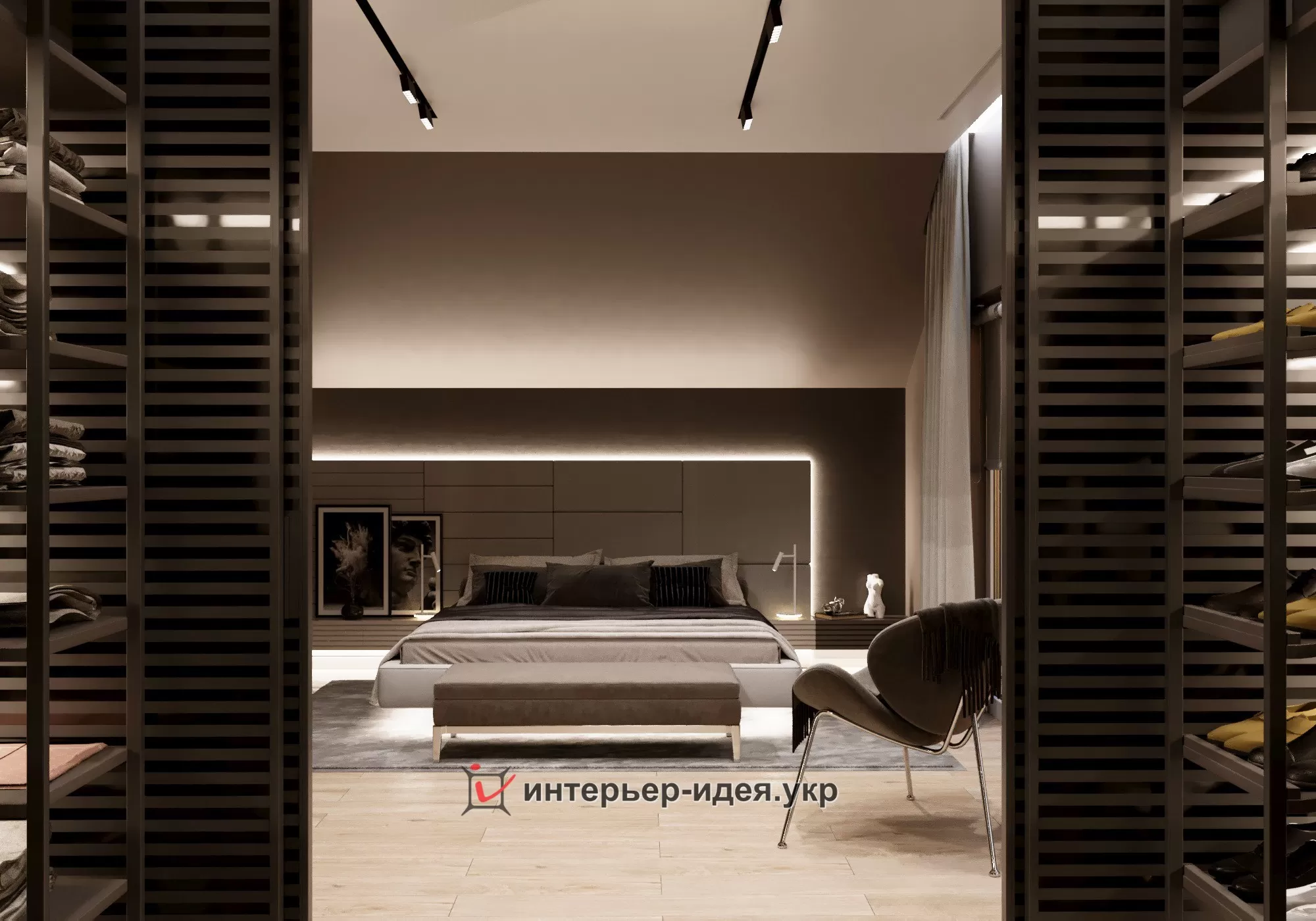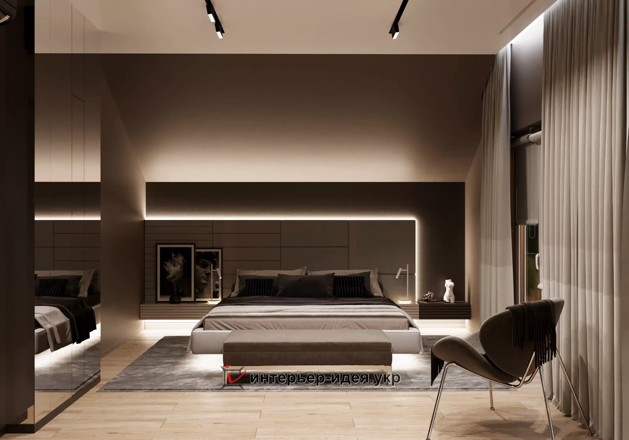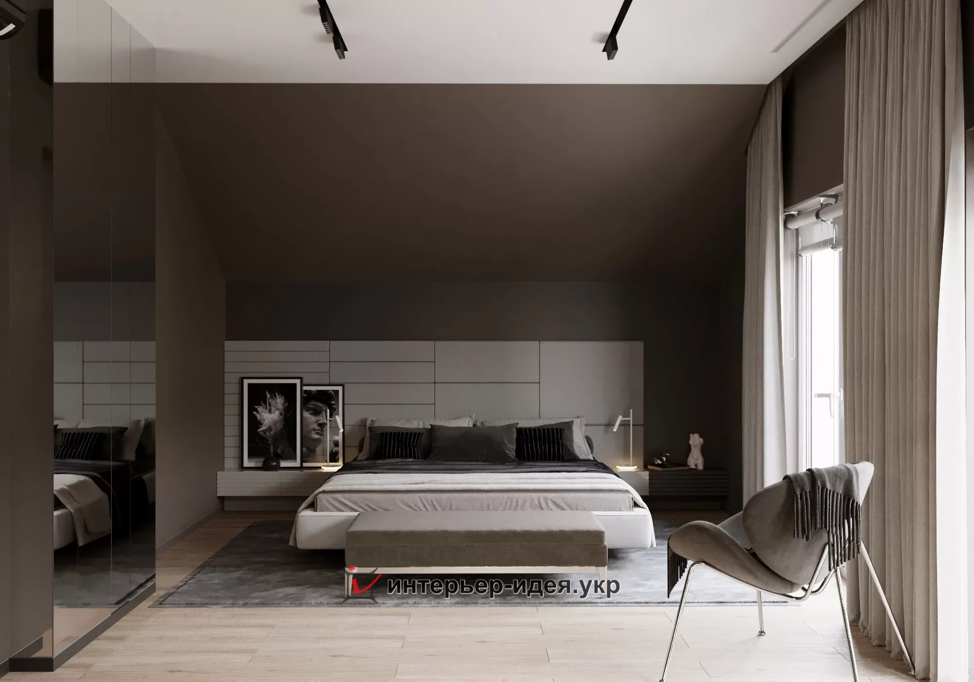 Наявність чоловічого гардероба і необхідність використання темних відтінків в інтер'єрі, так як спальня знаходиться з сонячної сторони будинку, відобразилися на атмосфері спальні.