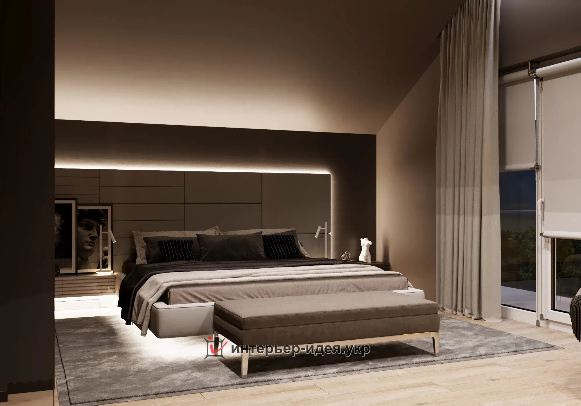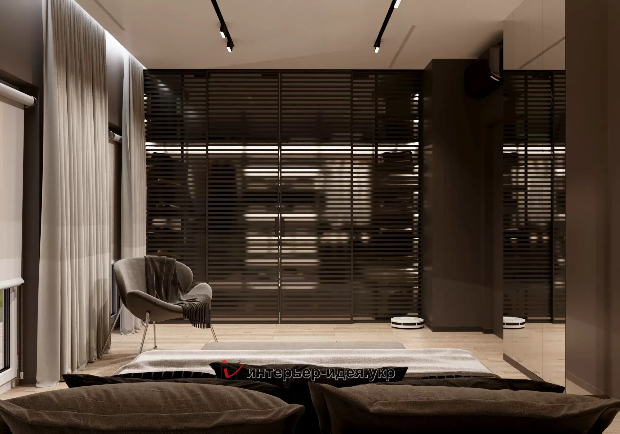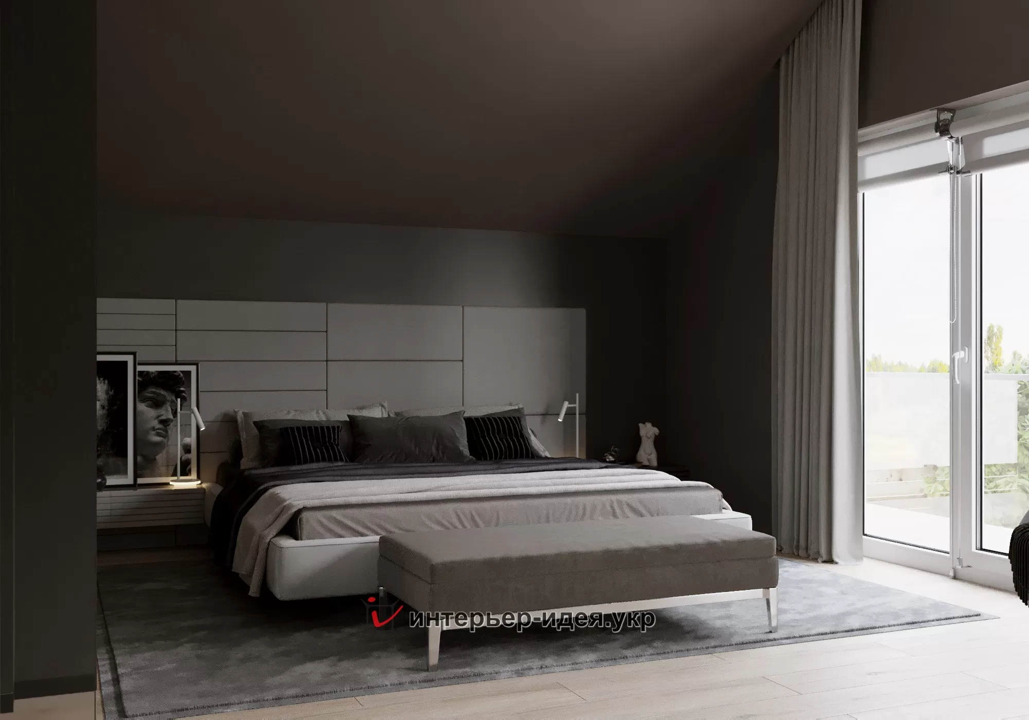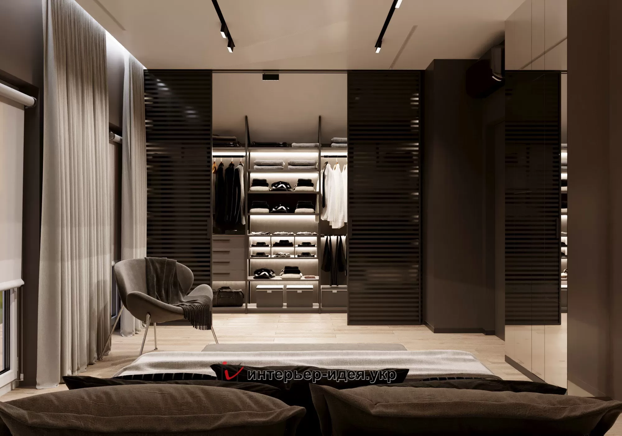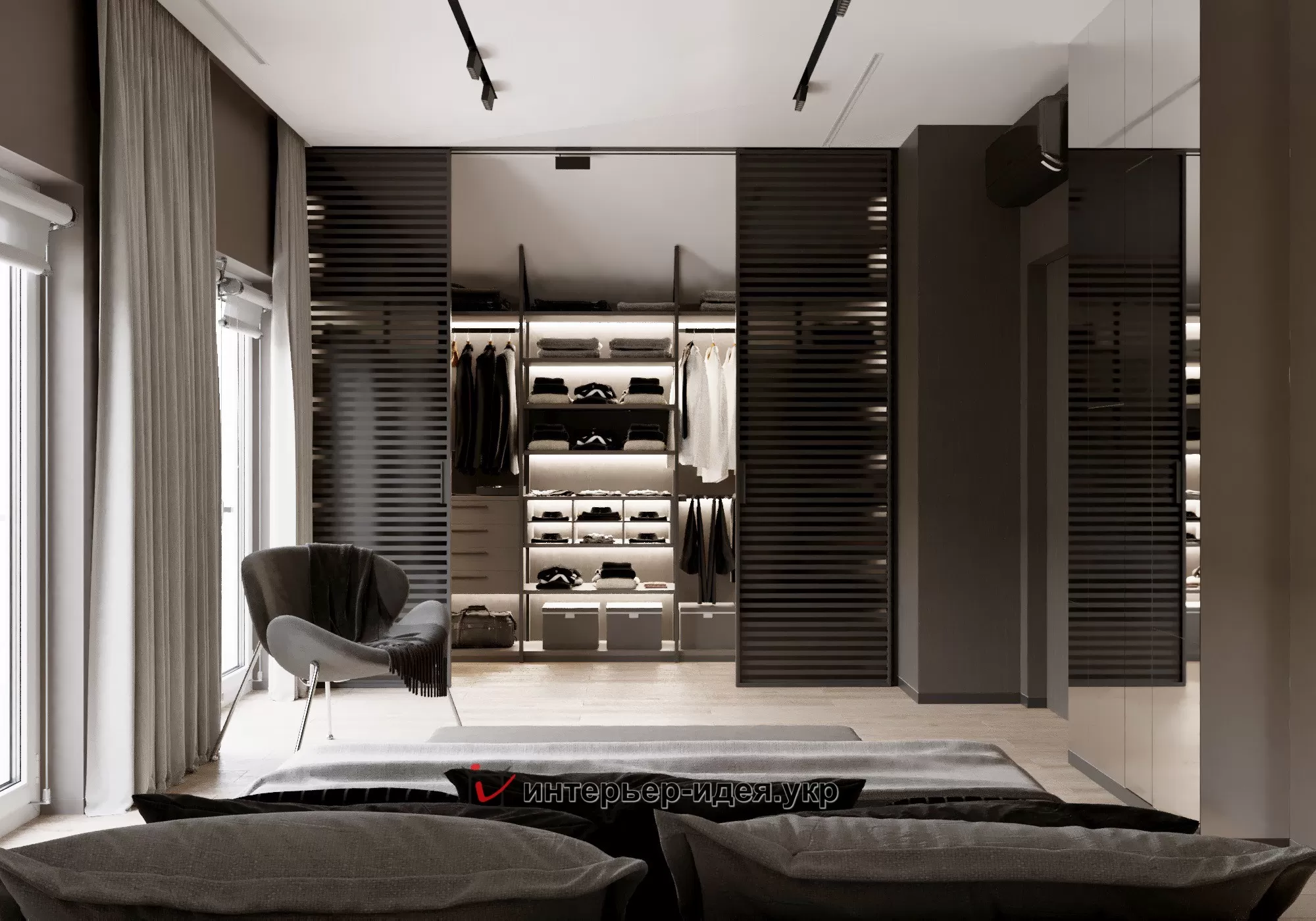 Наявність чоловічого гардероба і необхідність використання темних відтінків в інтер'єрі, так як спальня знаходиться з сонячної сторони будинку, відобразилися на атмосфері спальні.