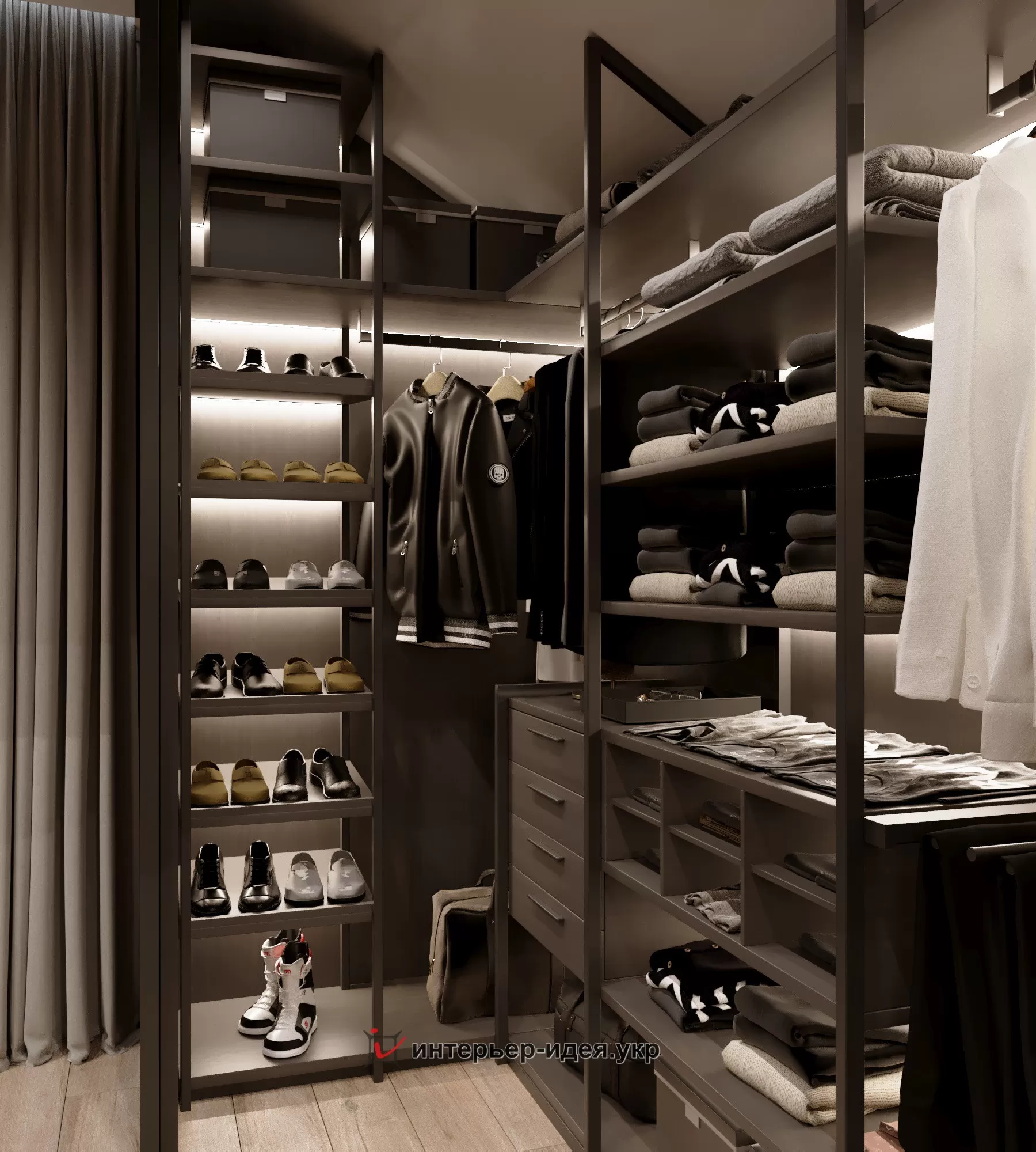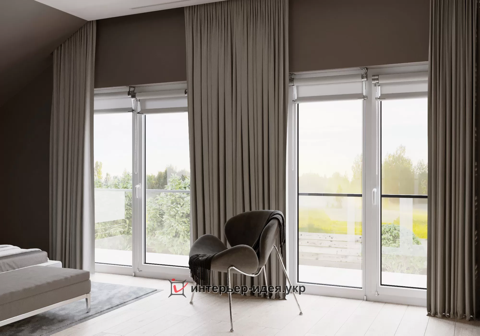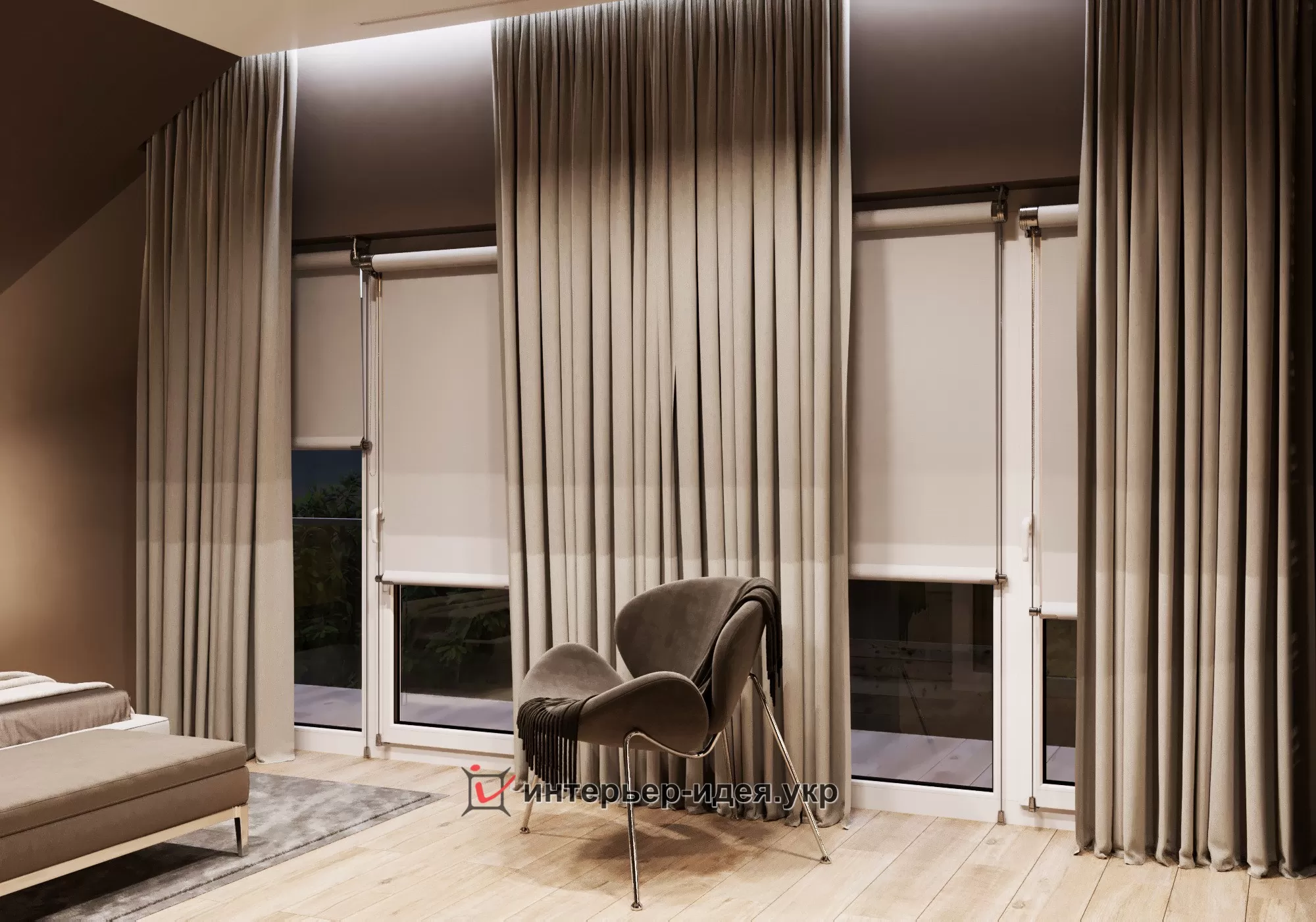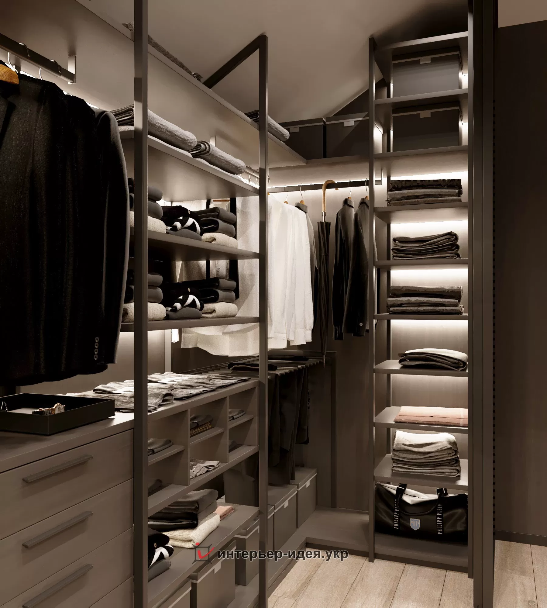 Наявність чоловічого гардероба і необхідність використання темних відтінків в інтер'єрі, так як спальня знаходиться з сонячної сторони будинку, відобразилися на атмосфері спальні.