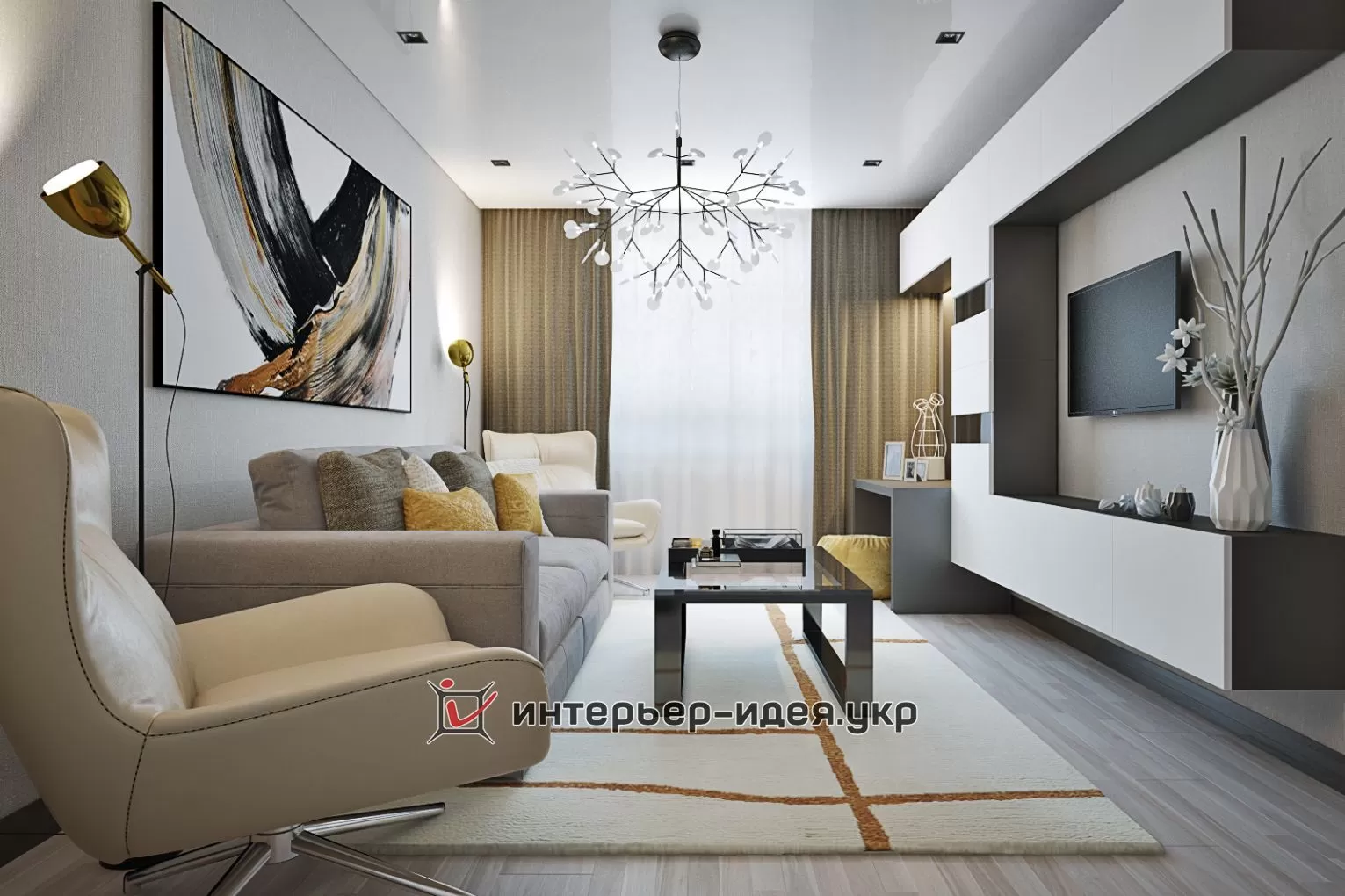 Дизайн вітальні в сірому кольорі з ніжно-лимонним акцентом, м. Черкаси