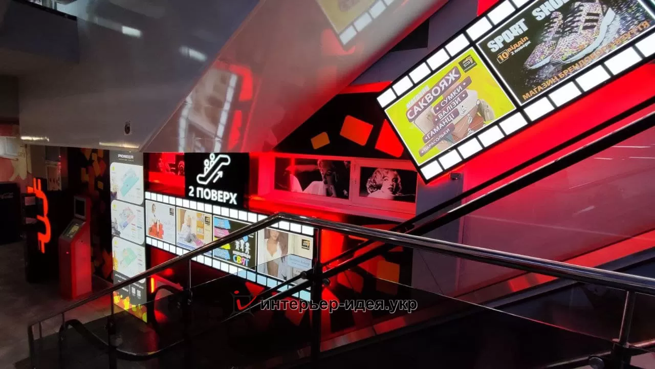 Для цього в зоні ескалатора ми розмістили великий навігаційний стенд, що світиться, помітний ще від вхідної вивіски. Стенди з рекламою орендарів вирішили оформити у вигляді кінострічки.